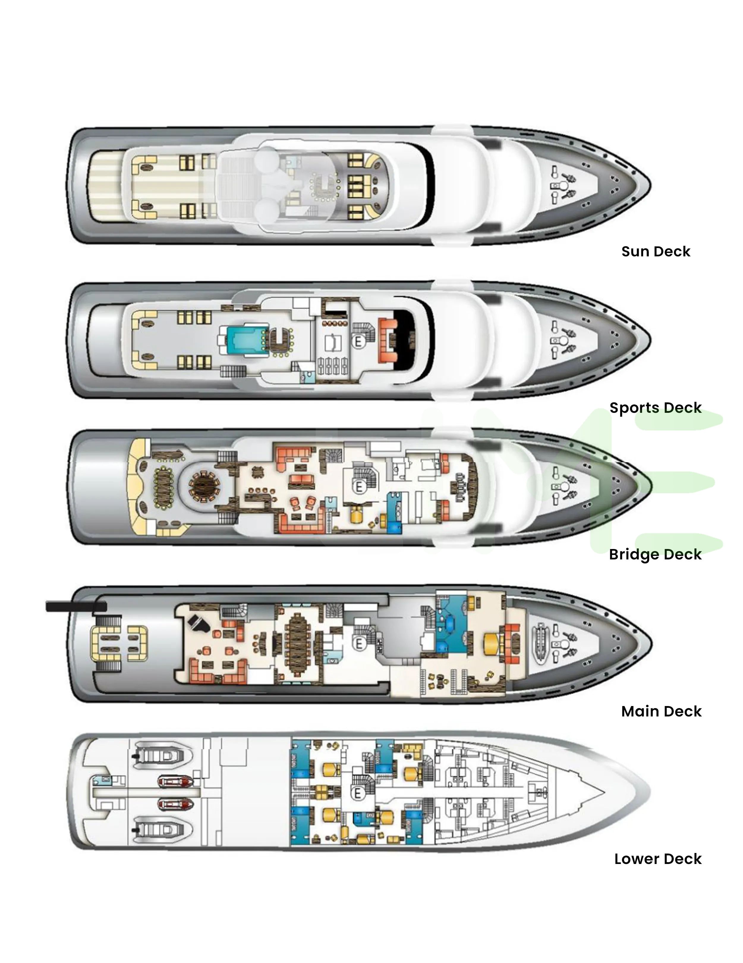 Request plans that include the layout of staterooms, guest areas, and outdoor spaces, as well as crew quarters and work areas.