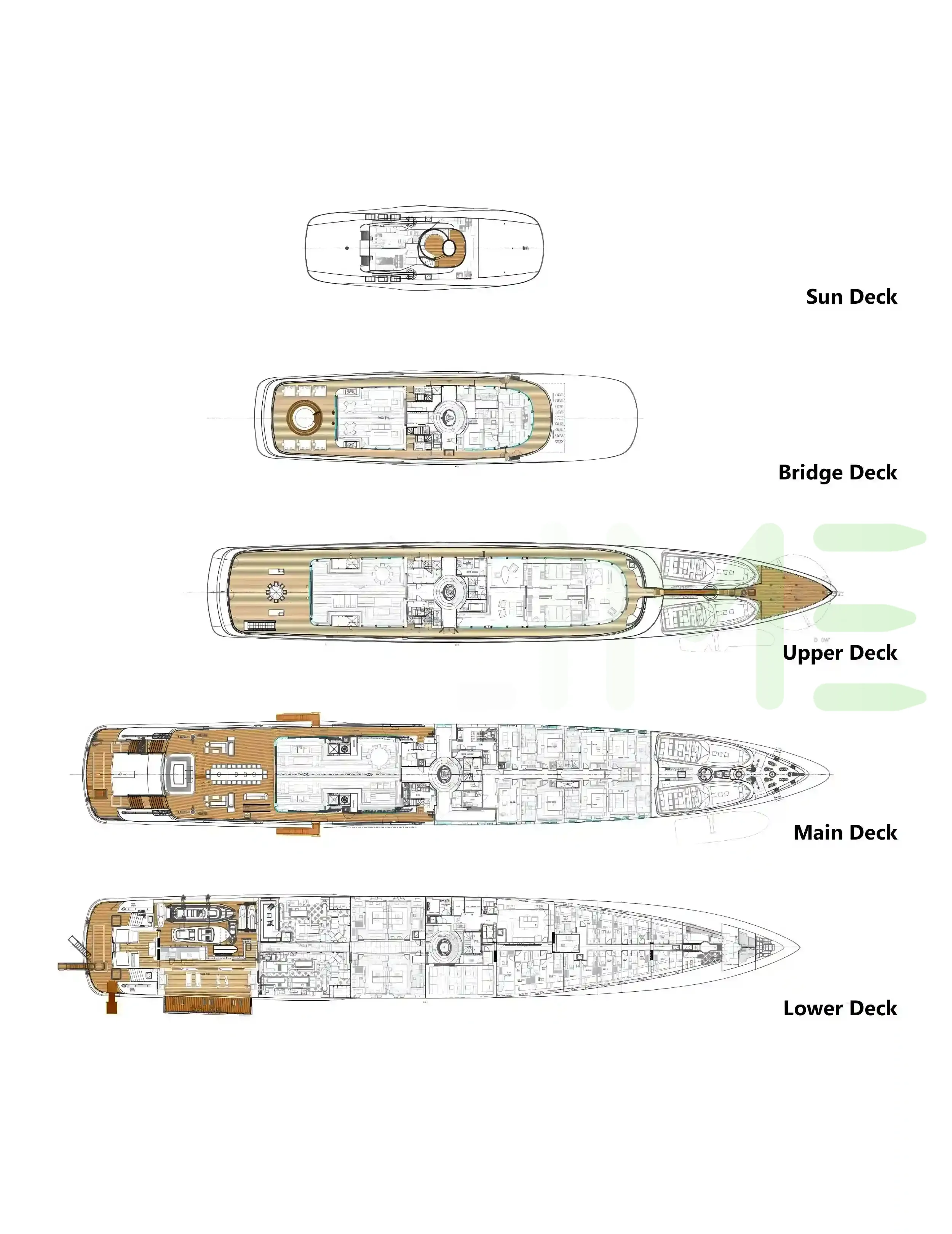 Request plans that include the layout of staterooms, guest areas, and outdoor spaces, as well as crew quarters and work areas.