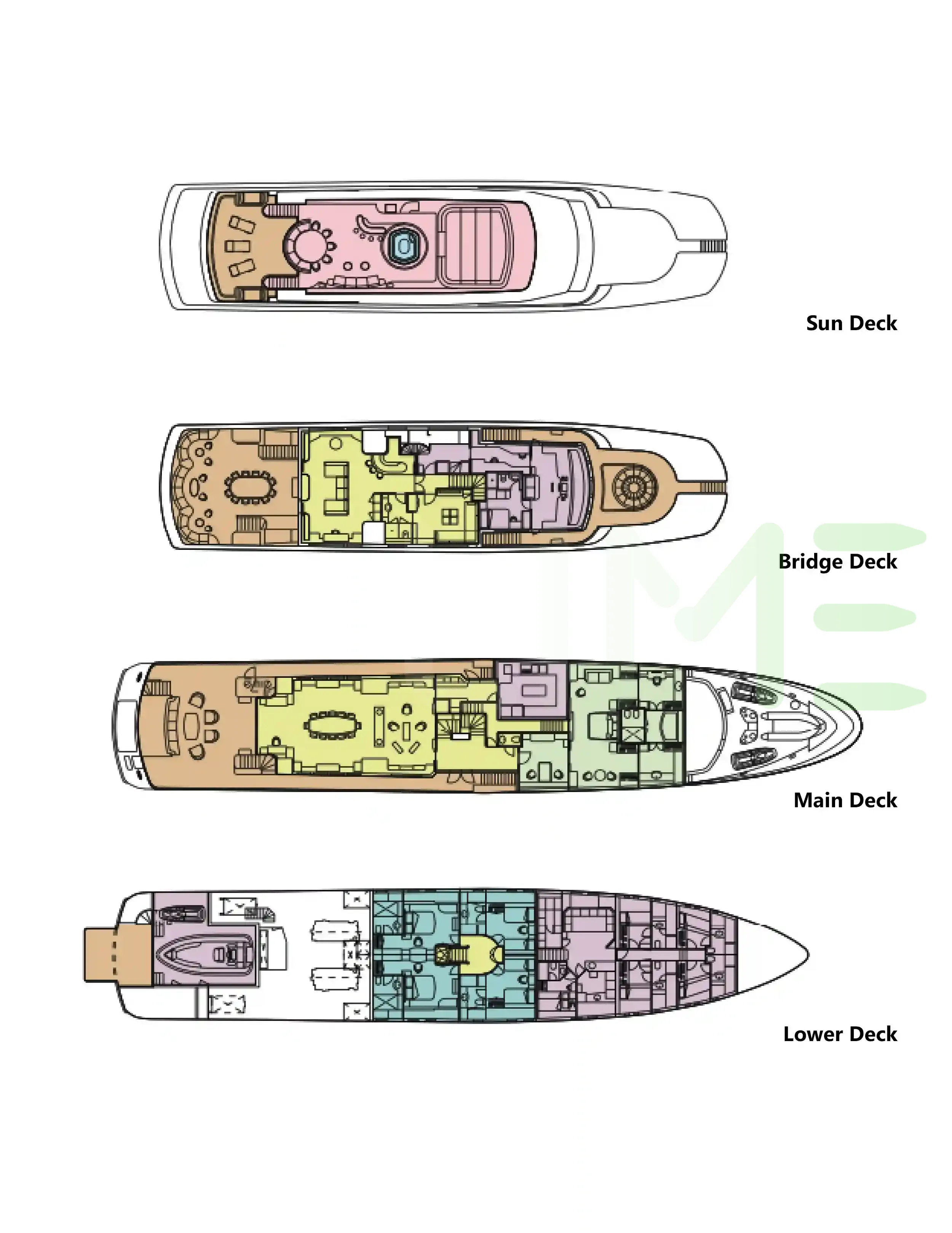 Request plans that include the layout of staterooms, guest areas, and outdoor spaces, as well as crew quarters and work areas.