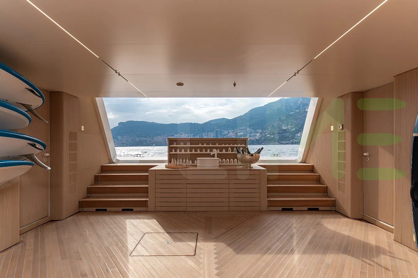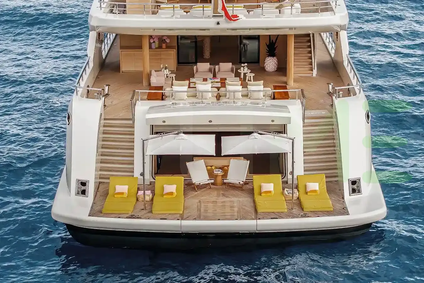 Her features include underwater lights, beach club, deck jacuzzi, WiFi and air conditioning.