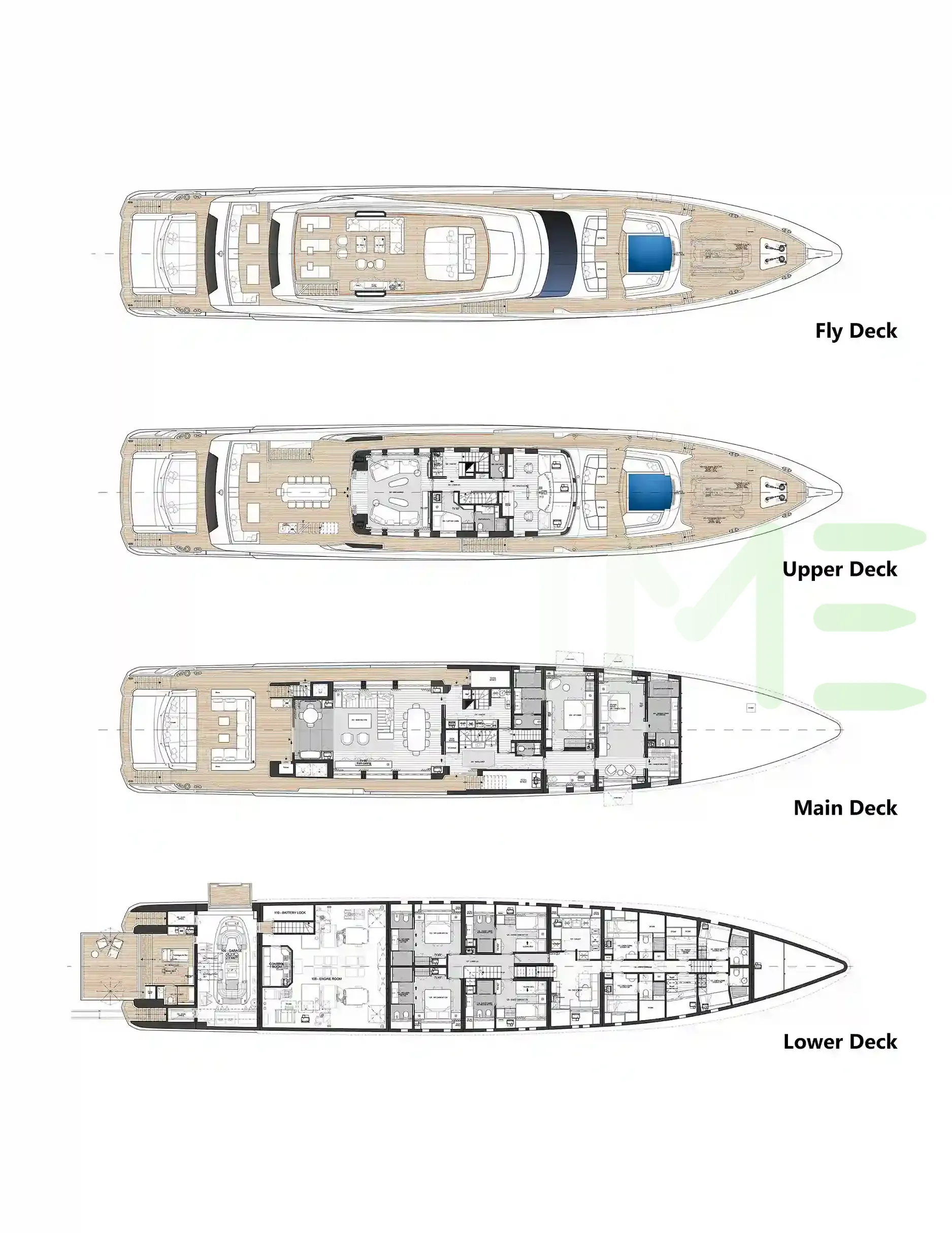 Request plans that include the layout of staterooms, guest areas, and outdoor spaces, as well as crew quarters and work areas.