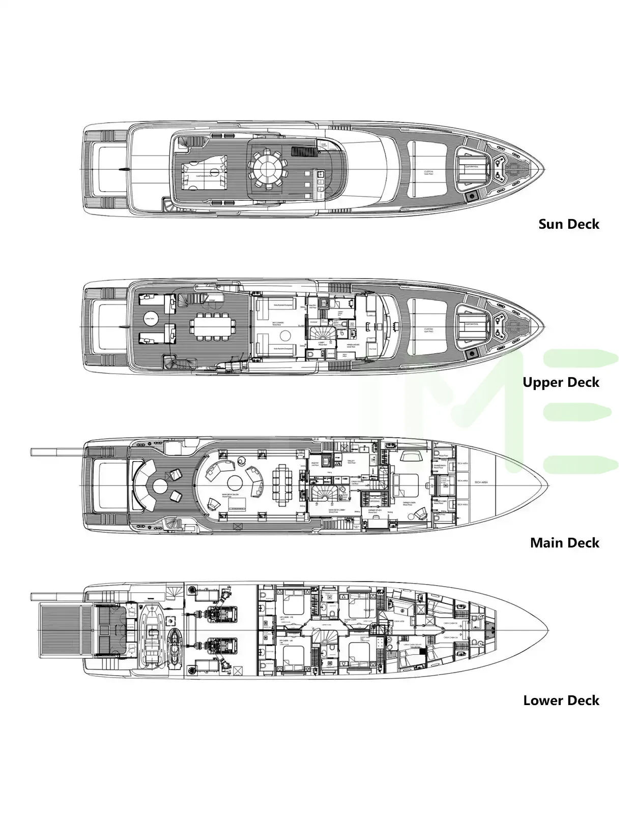 Request plans that include the layout of staterooms, guest areas, and outdoor spaces, as well as crew quarters and work areas.