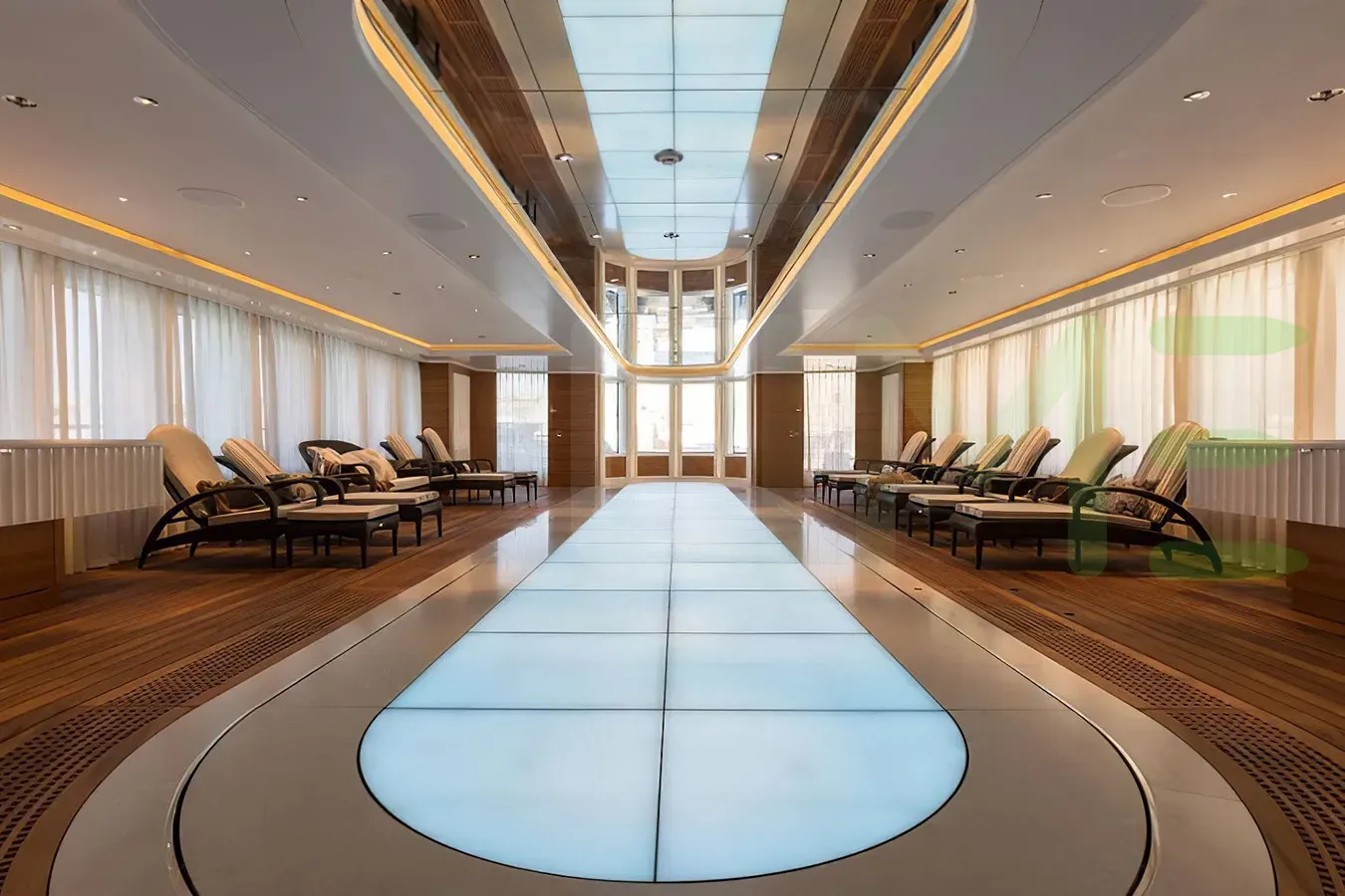 Her features include a dancefloor, beauty salon, elevator, gym and air conditioning.