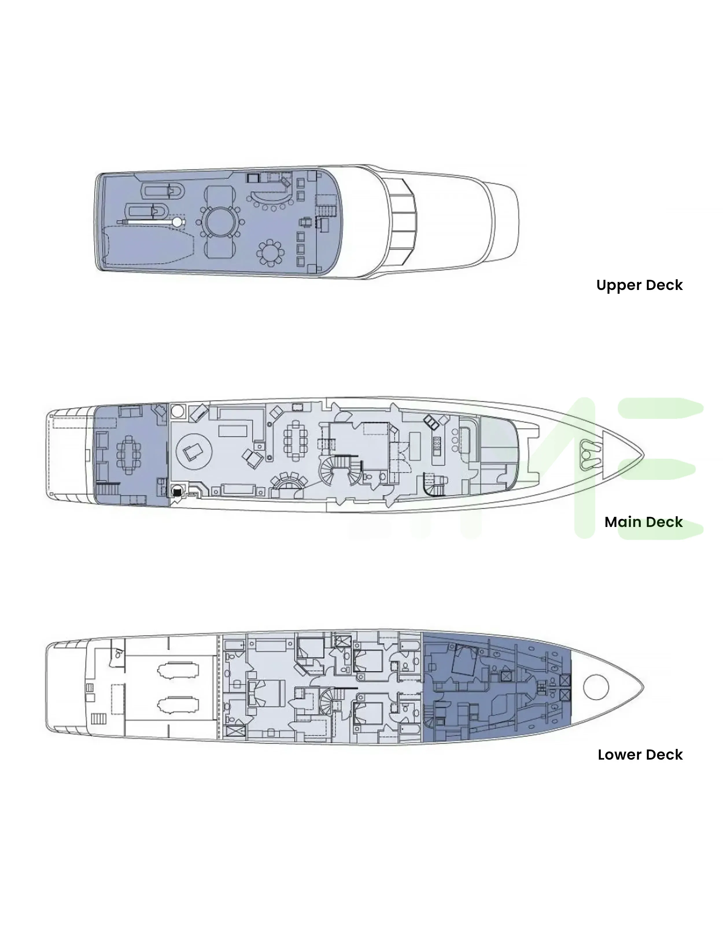 Request plans that include the layout of staterooms, guest areas, and outdoor spaces, as well as crew quarters and work areas.