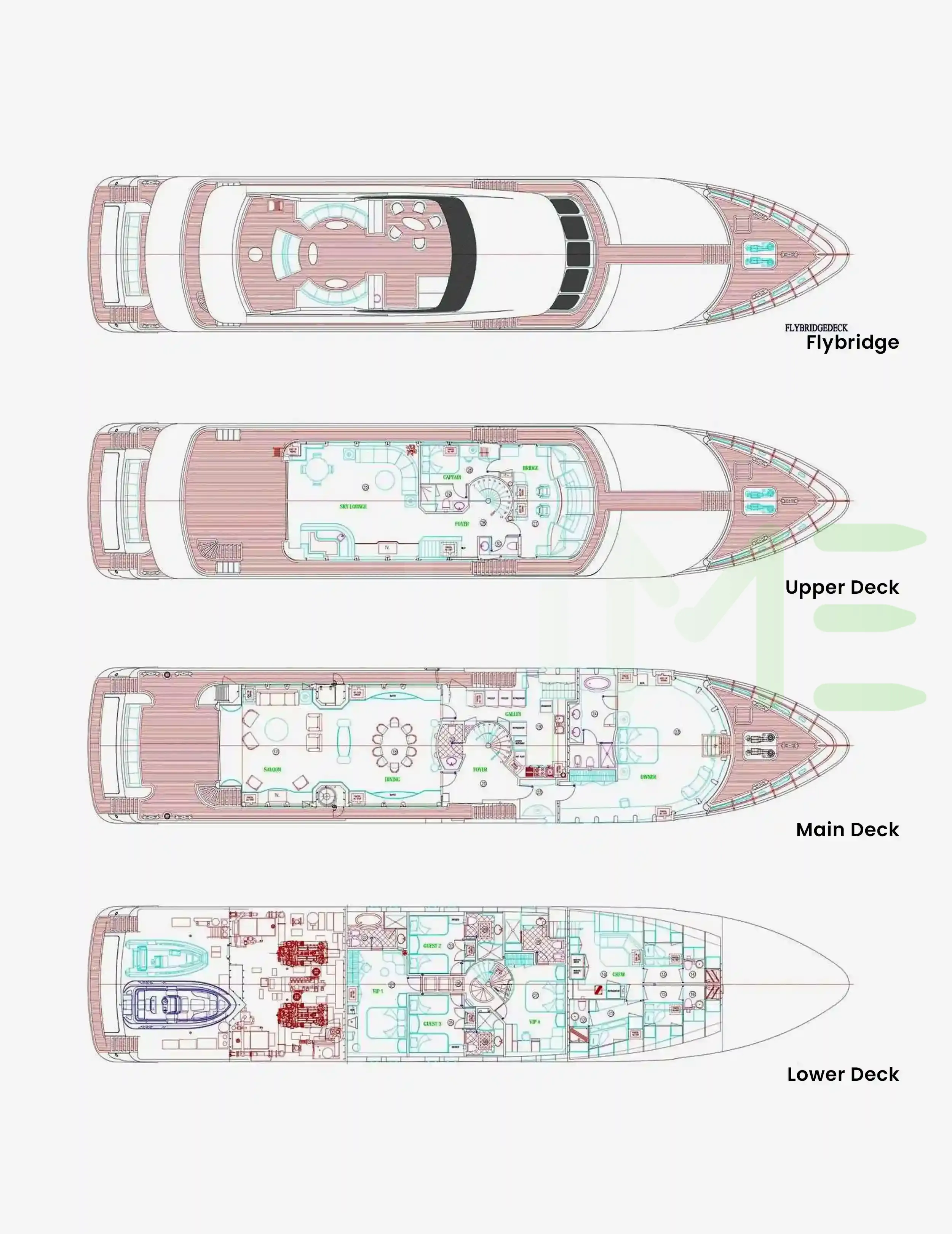 Request plans that include the layout of staterooms, guest areas, and outdoor spaces, as well as crew quarters and work areas.