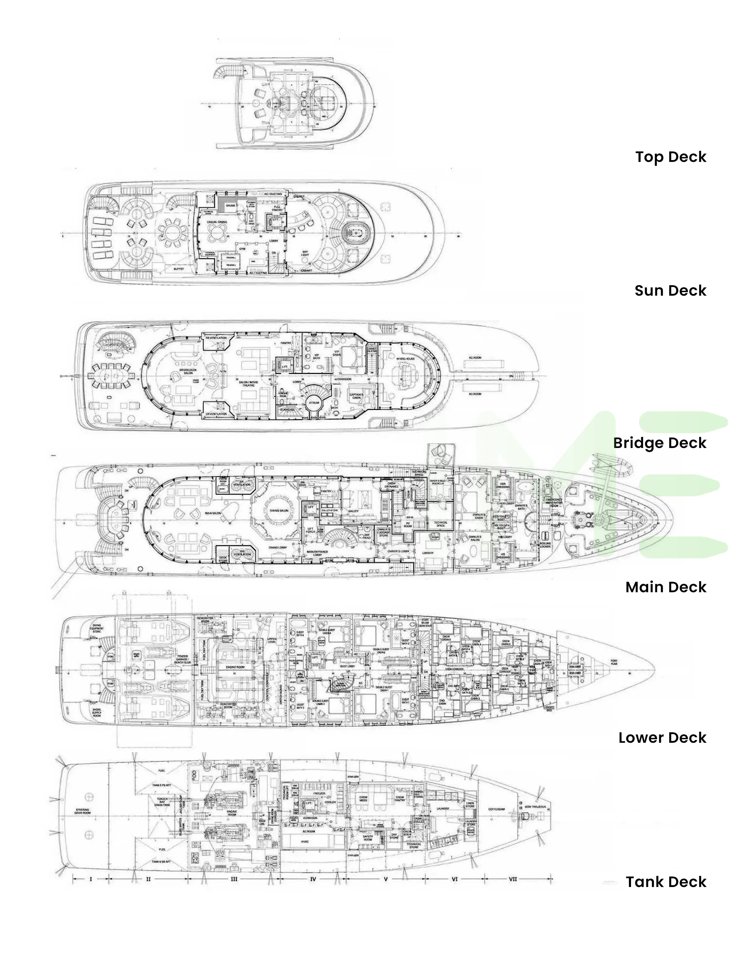 Request plans that include the layout of staterooms, guest areas, and outdoor spaces, as well as crew quarters and work areas.
