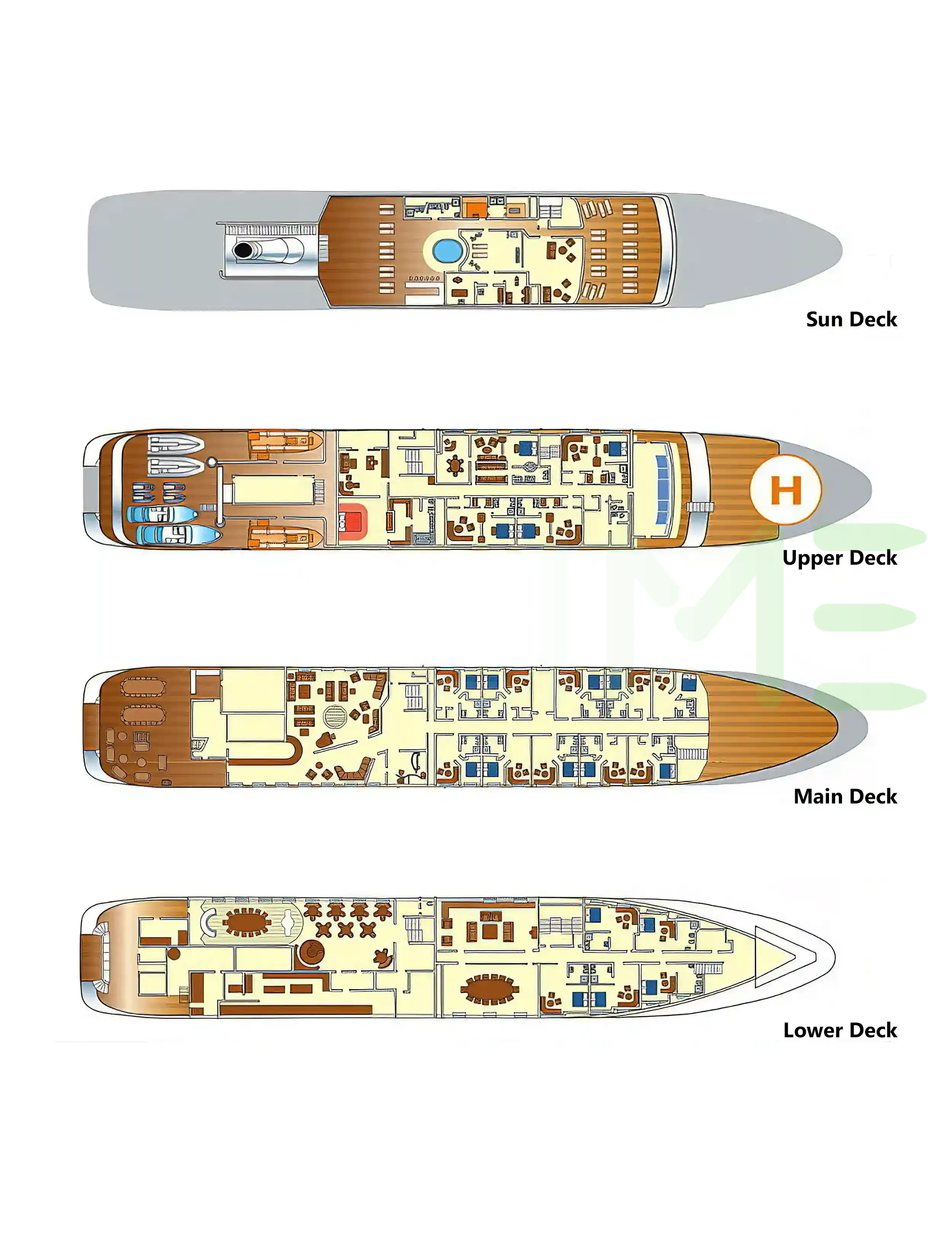 Request plans that include the layout of staterooms, guest areas, and outdoor spaces, as well as crew quarters and work areas.