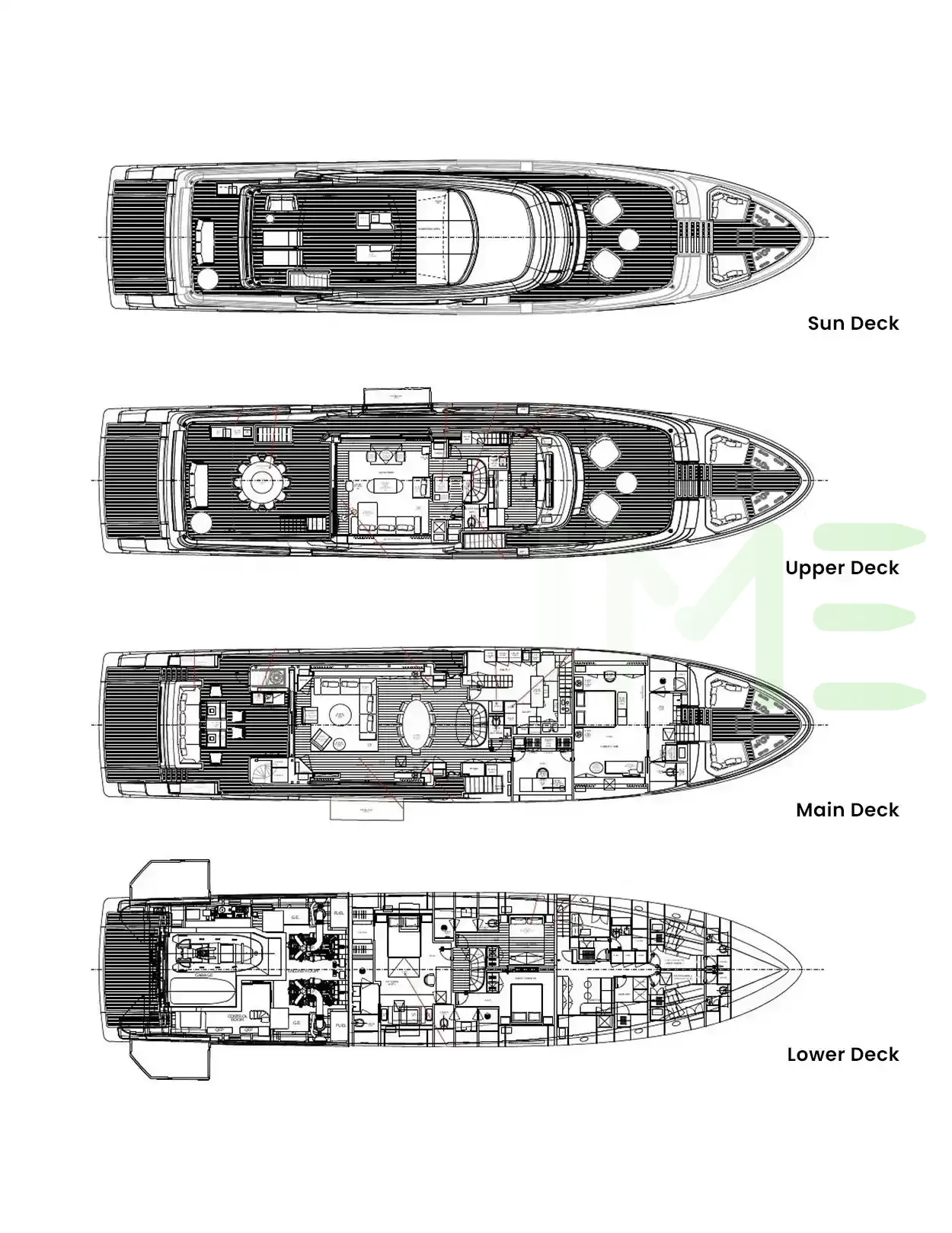 Request plans that include the layout of staterooms, guest areas, and outdoor spaces, as well as crew quarters and work areas.