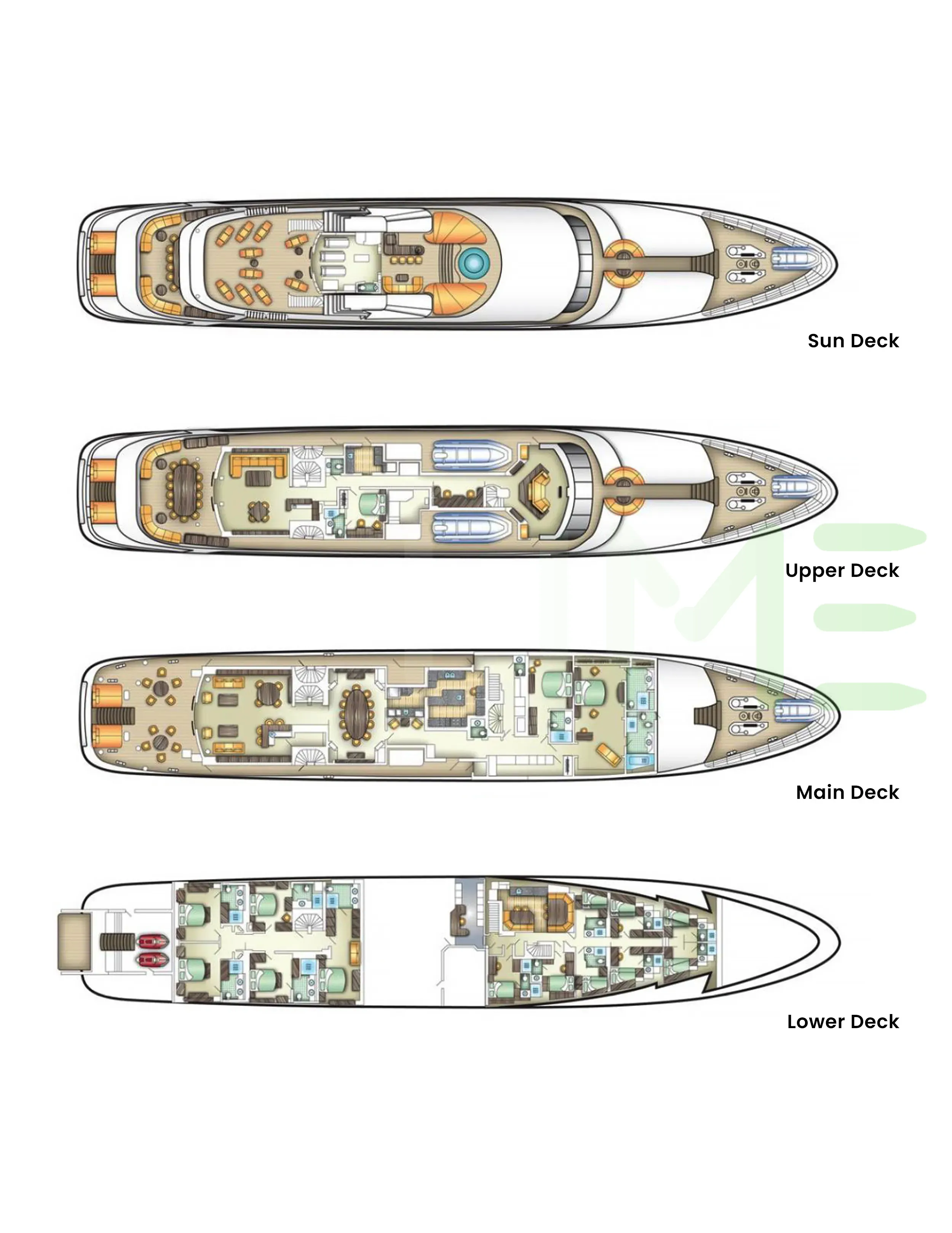 Request plans that include the layout of staterooms, guest areas, and outdoor spaces, as well as crew quarters and work areas.