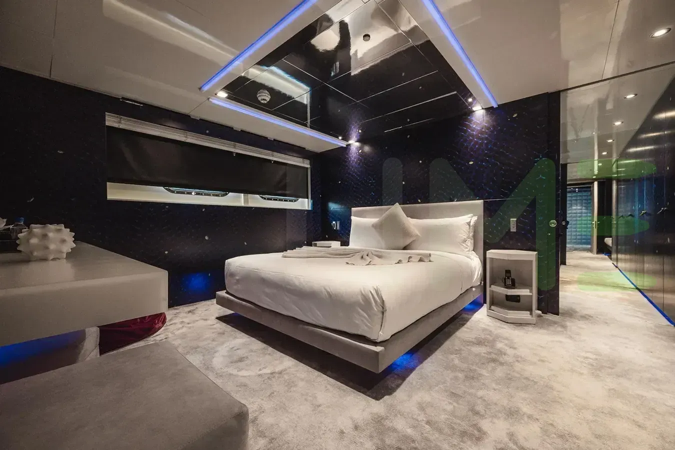Her features include a dancefloor, movie theatre, underwater lights, gym, deck jacuzzi, WiFi and air conditioning.