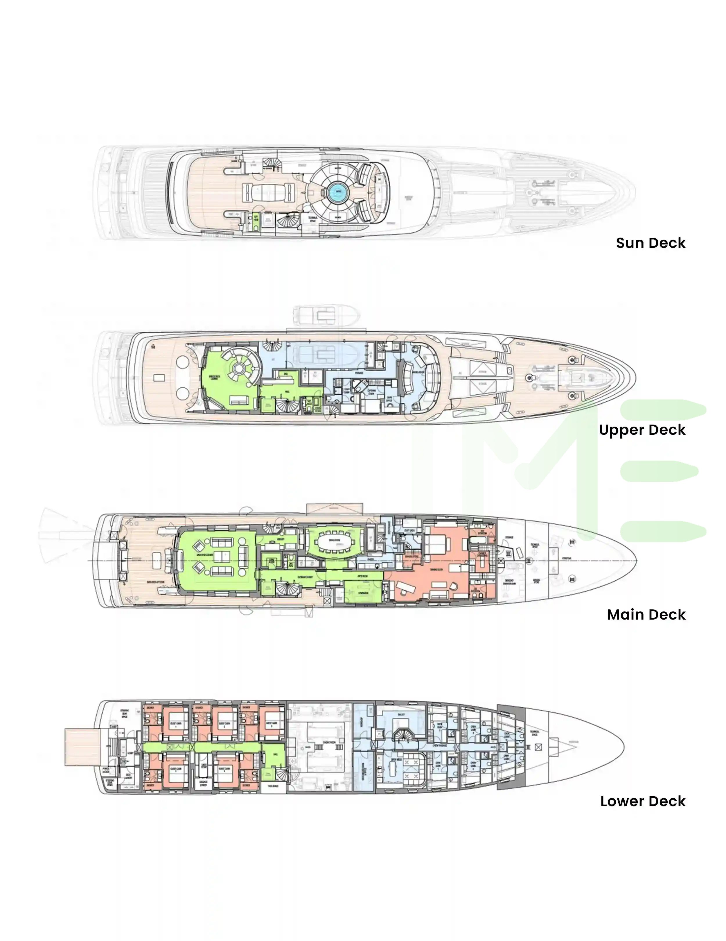 Request plans that include the layout of staterooms, guest areas, and outdoor spaces, as well as crew quarters and work areas.