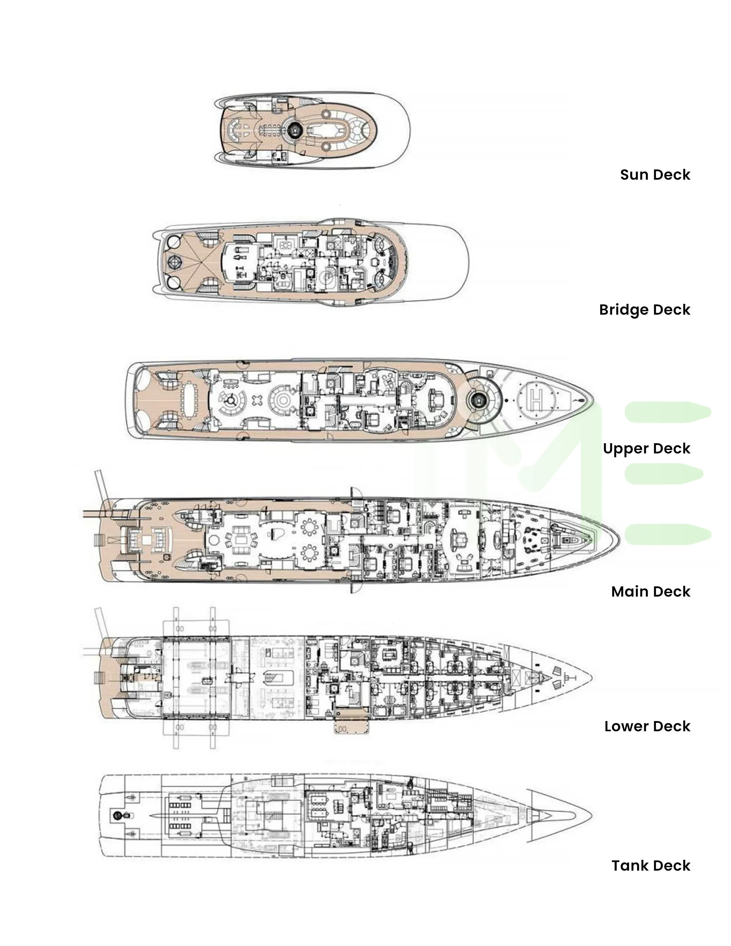 Request plans that include the layout of staterooms, guest areas, and outdoor spaces, as well as crew quarters and work areas.