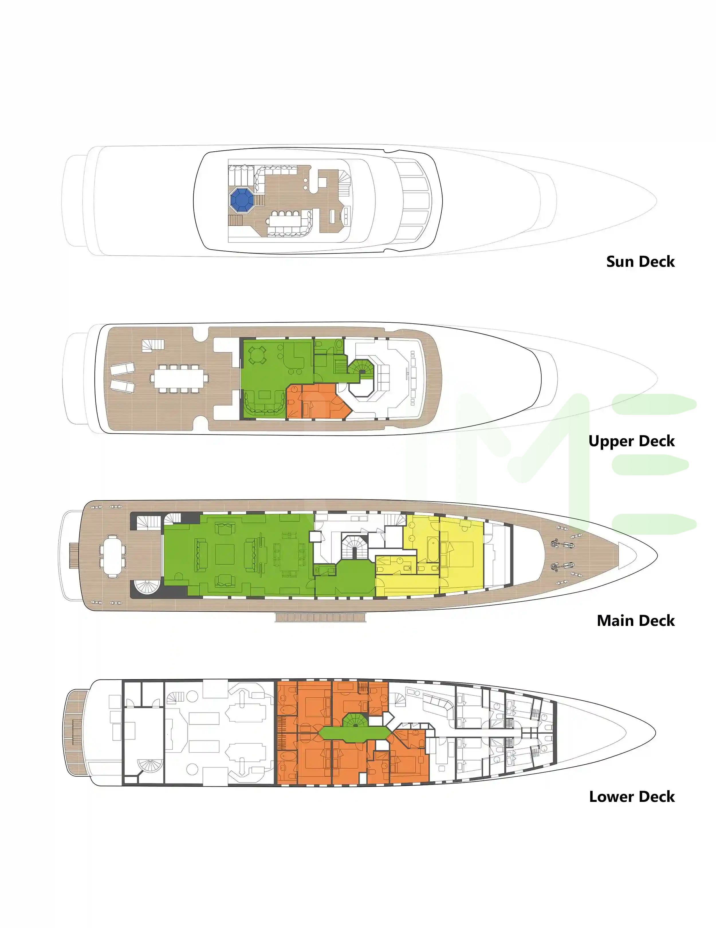 Request plans that include the layout of staterooms, guest areas, and outdoor spaces, as well as crew quarters and work areas.