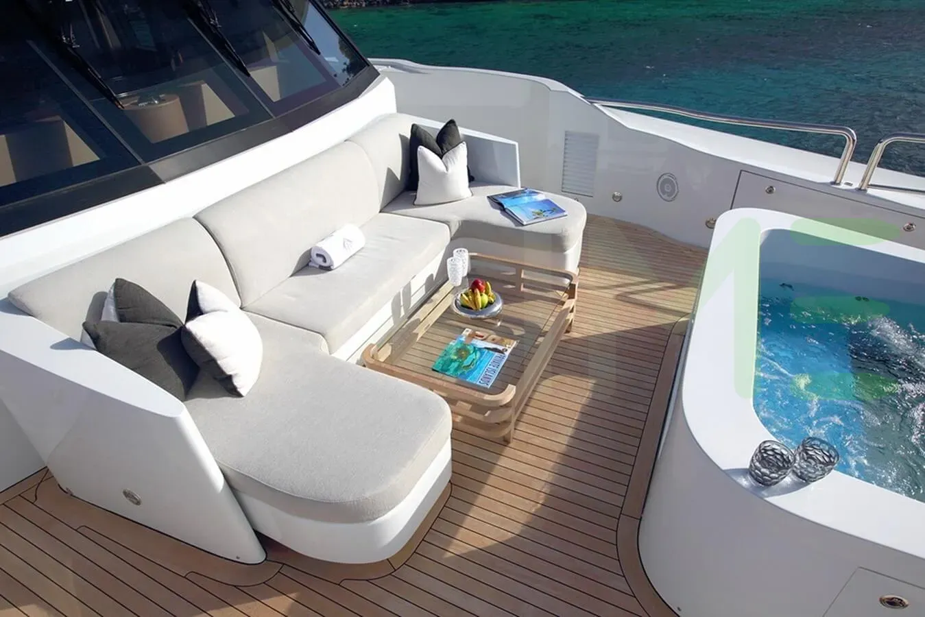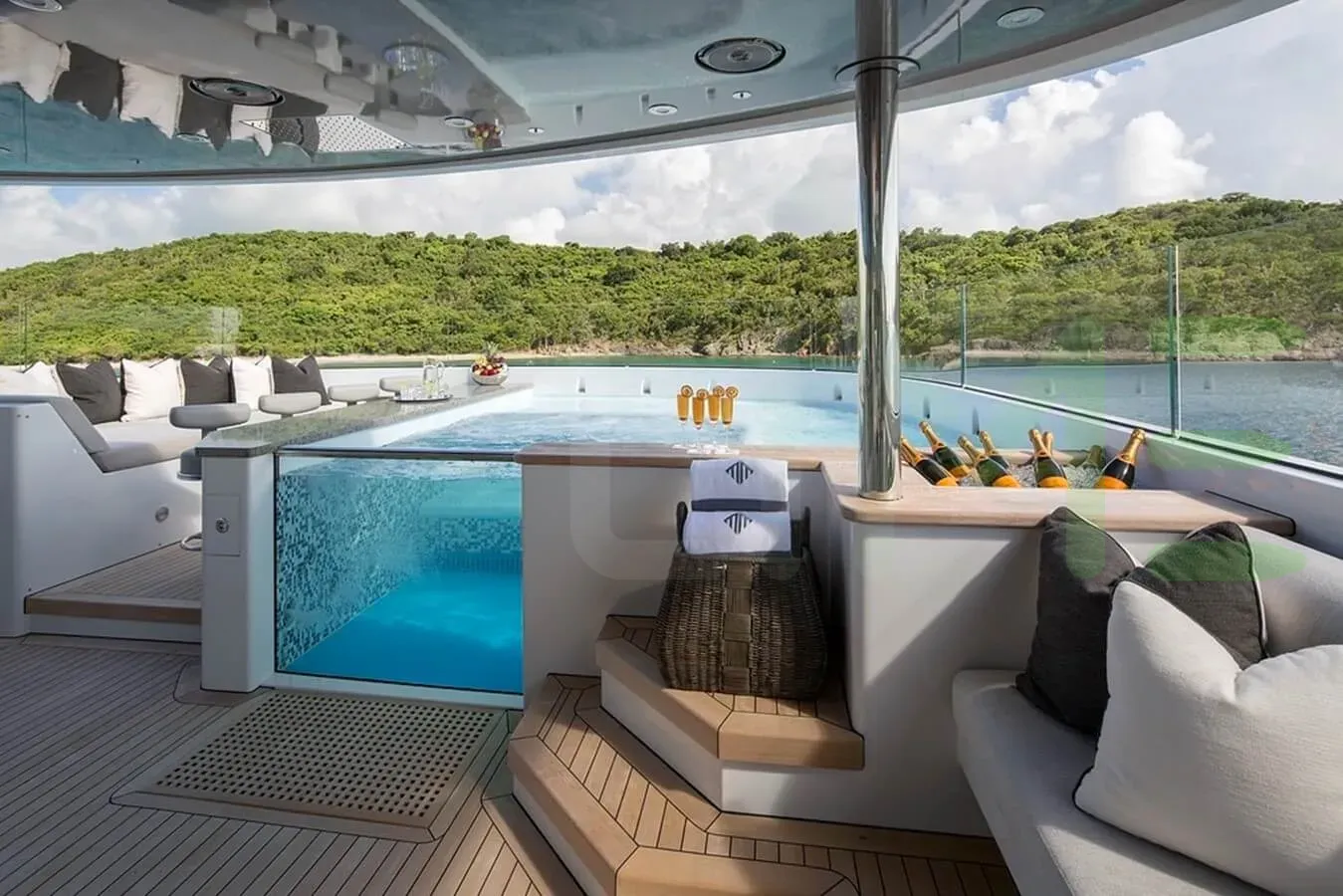 On your charter, you'll find plenty to keep you busy and entertained such as a beach club for you to relax on the edge of the water. Sit back with a glass of champagne in the deck jacuzzi.