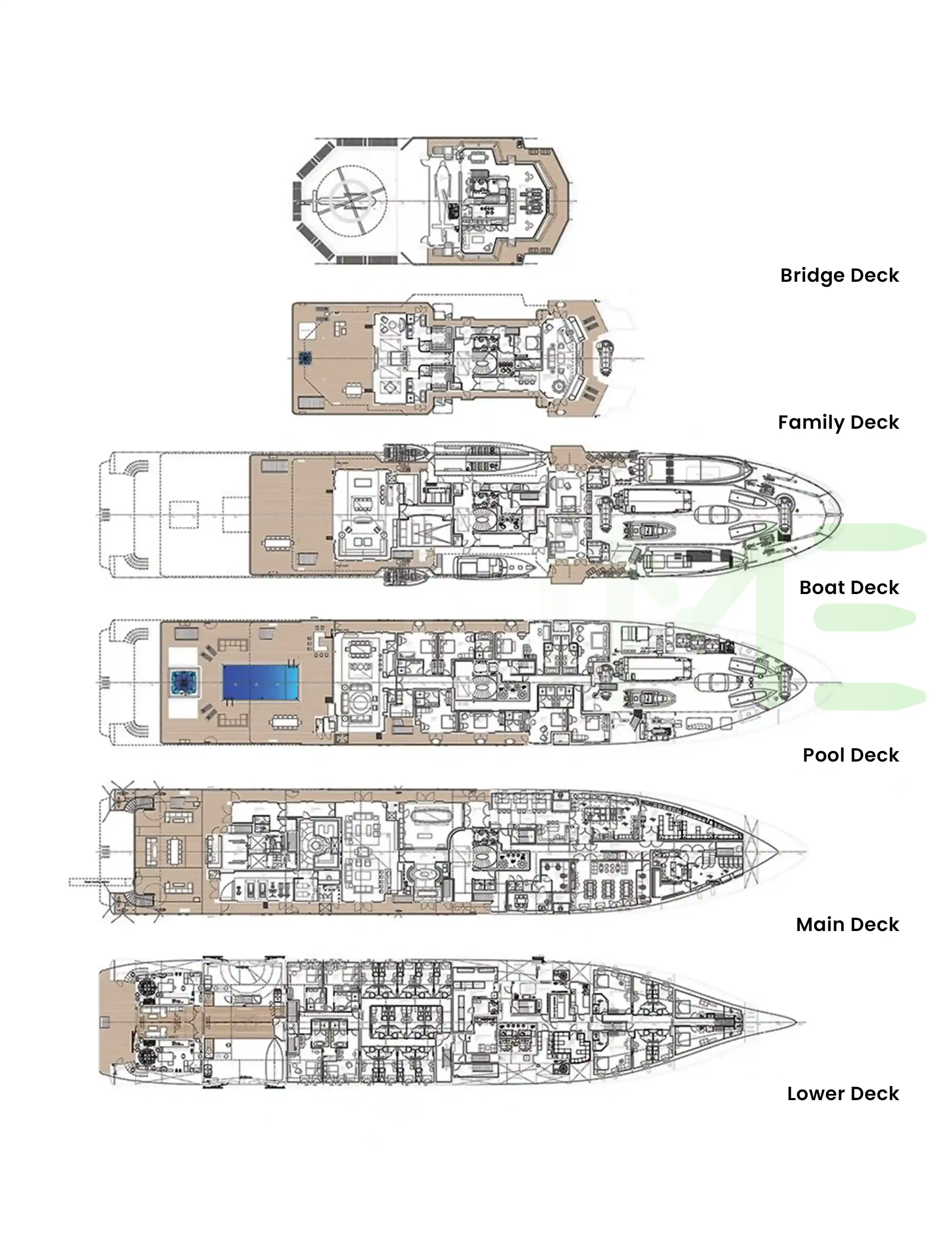 Request plans that include the layout of staterooms, guest areas, and outdoor spaces, as well as crew quarters and work areas.