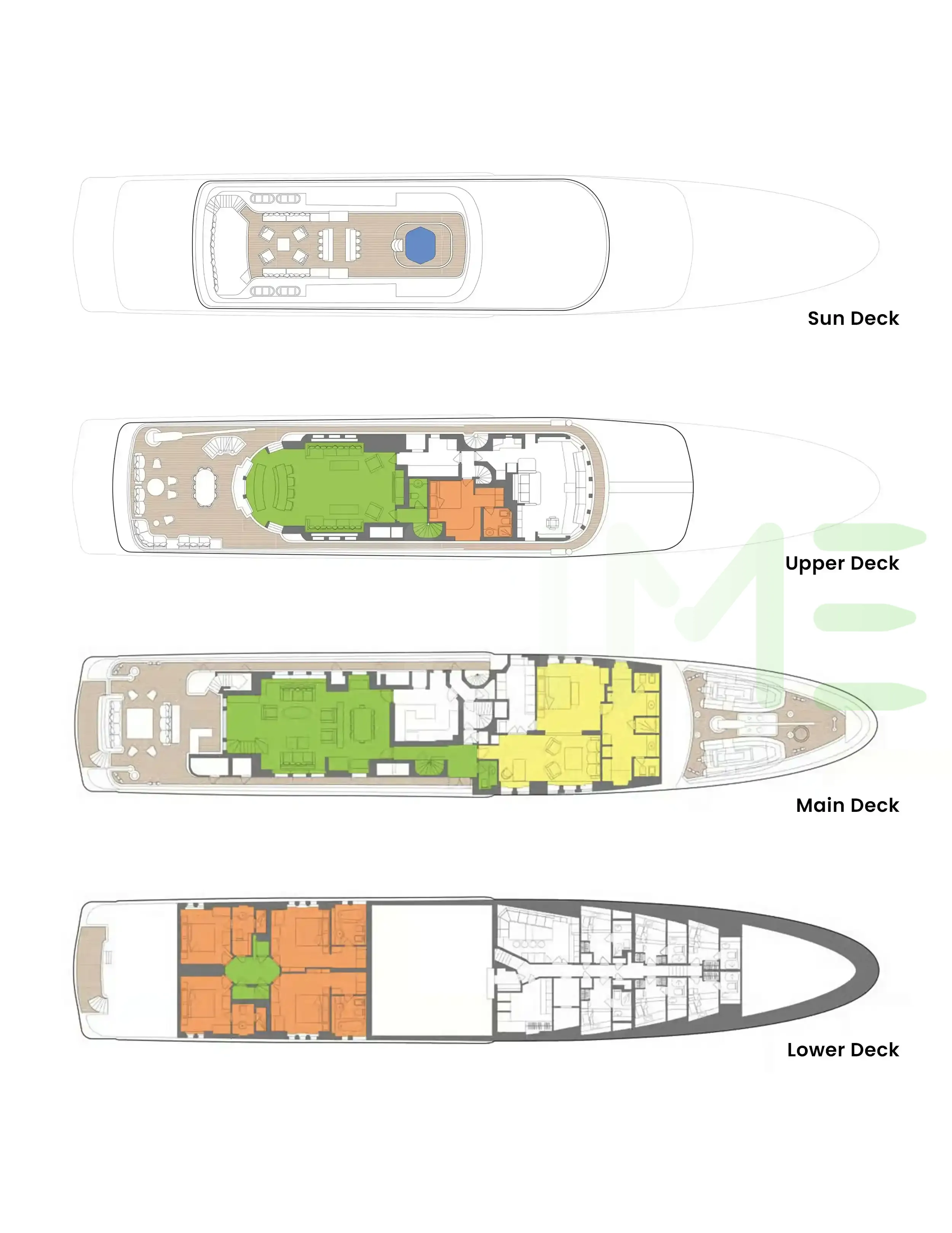 Request plans that include the layout of staterooms, guest areas, and outdoor spaces, as well as crew quarters and work areas.