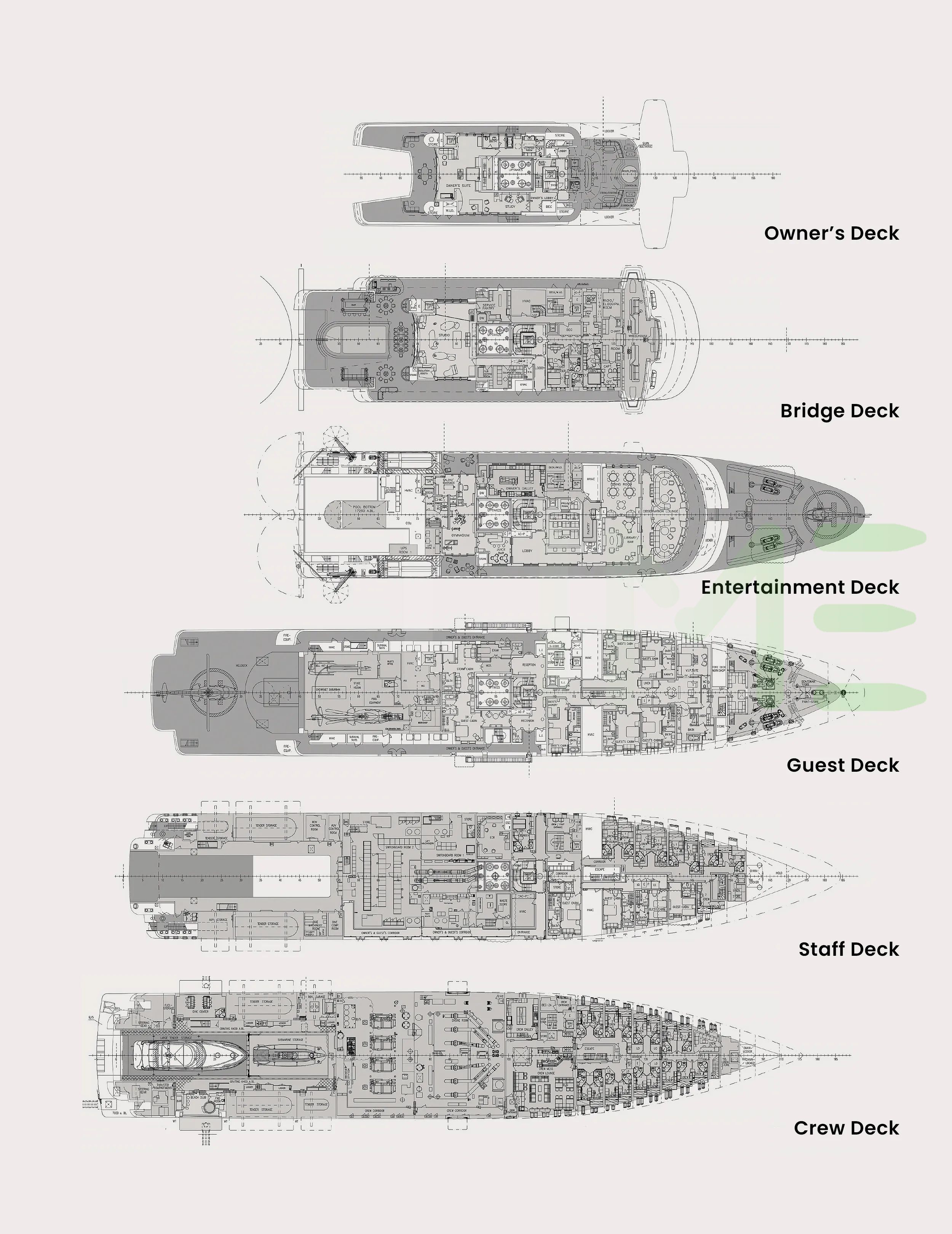 Request plans that include the layout of staterooms, guest areas, and outdoor spaces, as well as crew quarters and work areas.