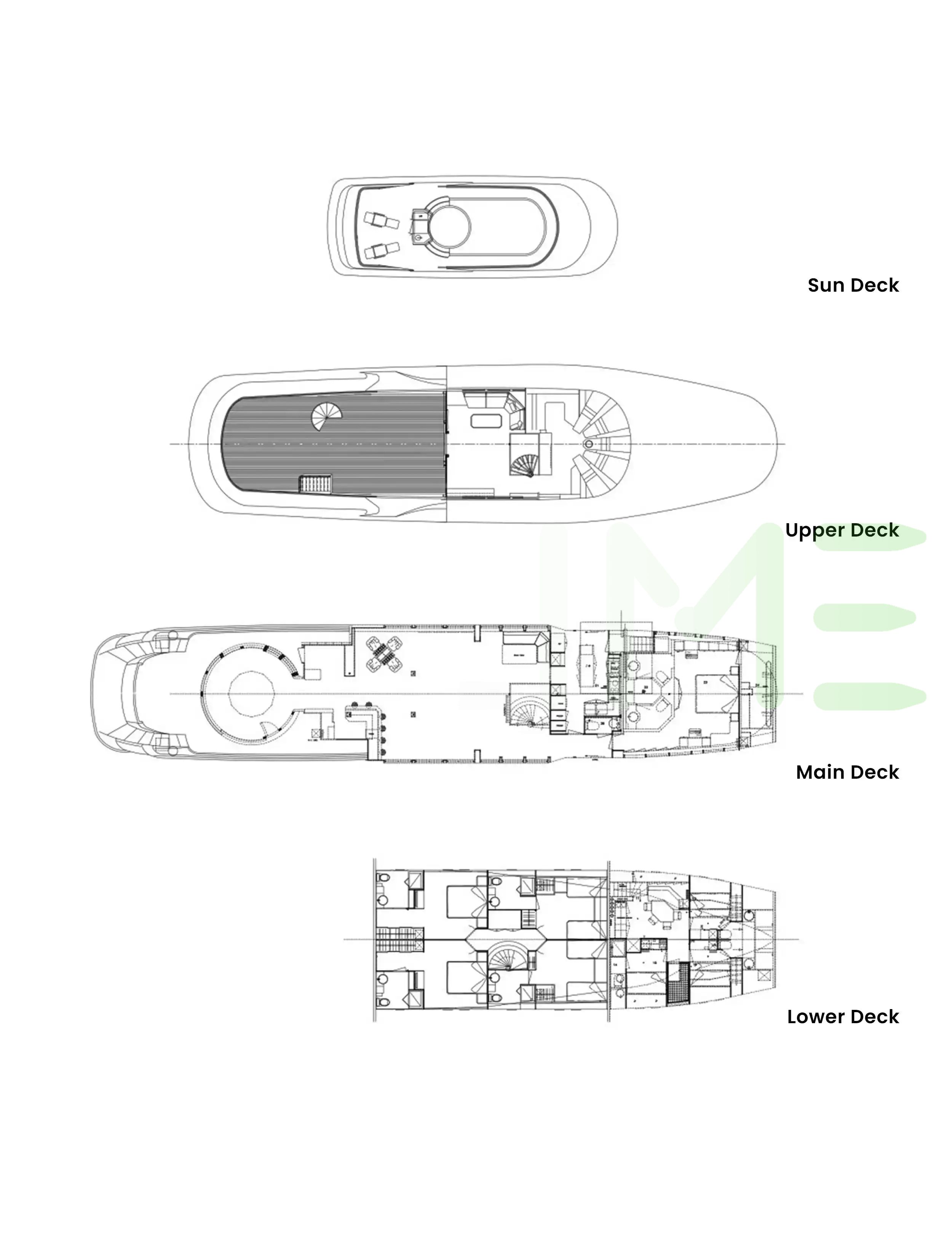 Request plans that include the layout of staterooms, guest areas, and outdoor spaces, as well as crew quarters and work areas.