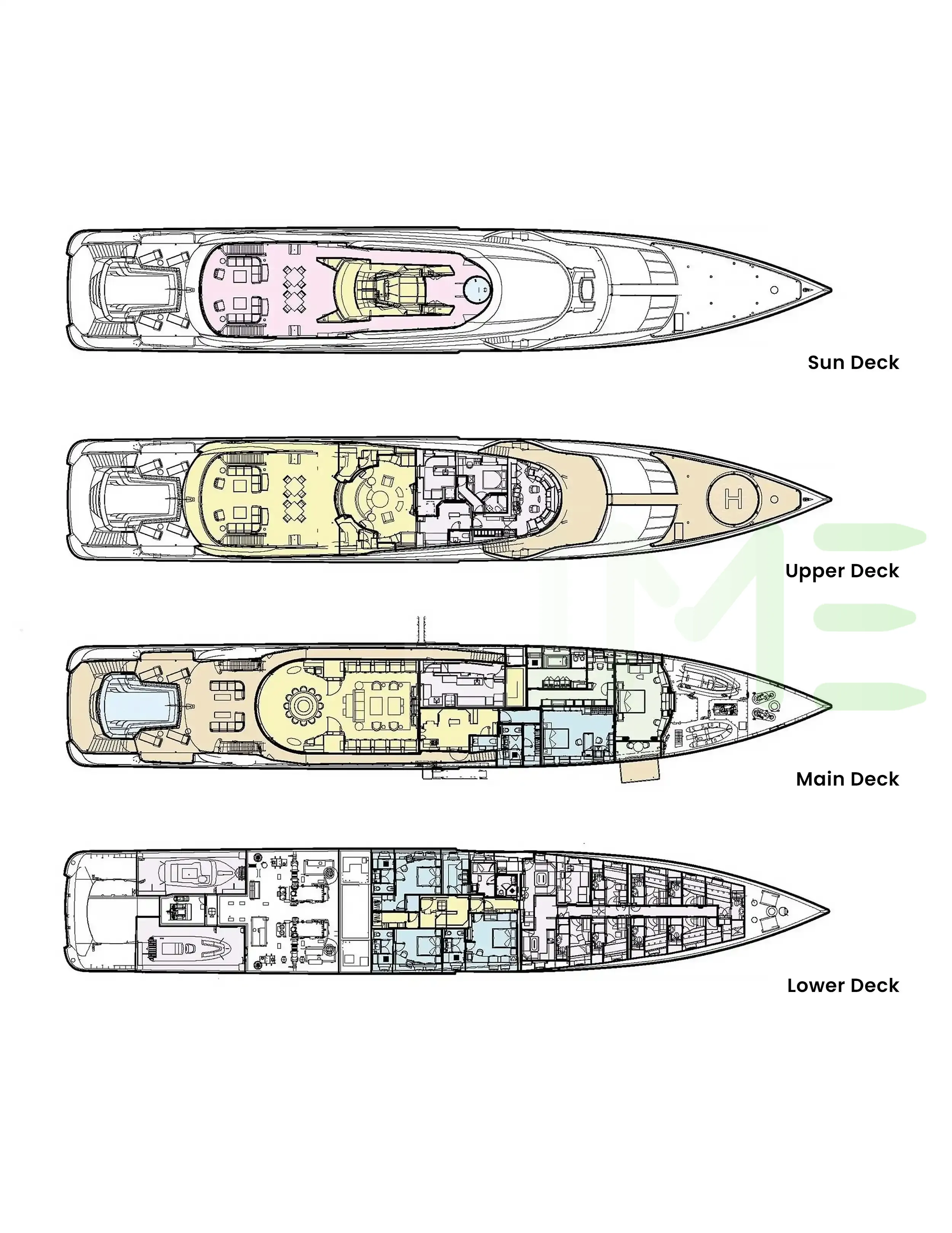 Request plans that include the layout of staterooms, guest areas, and outdoor spaces, as well as crew quarters and work areas.