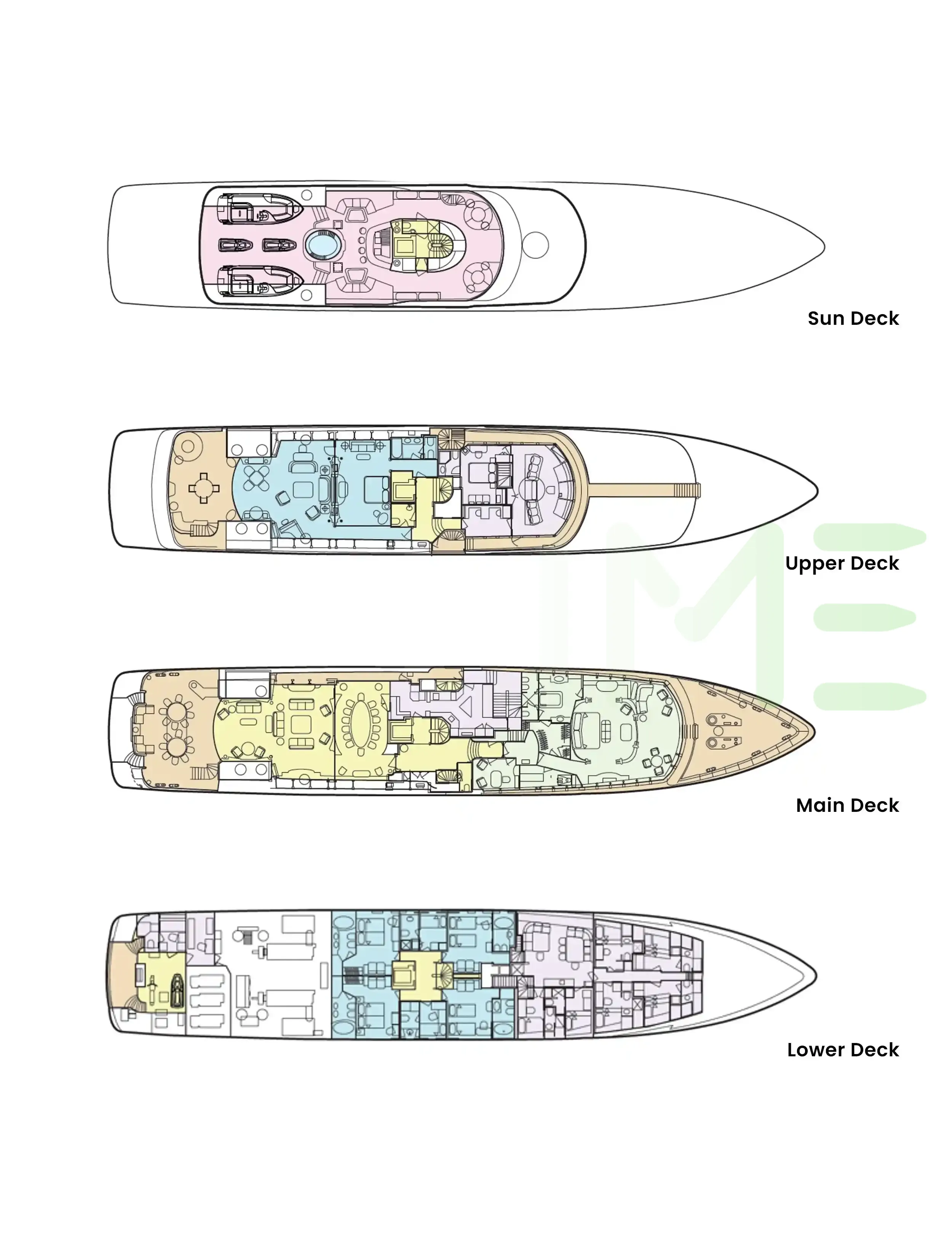 Request plans that include the layout of staterooms, guest areas, and outdoor spaces, as well as crew quarters and work areas.