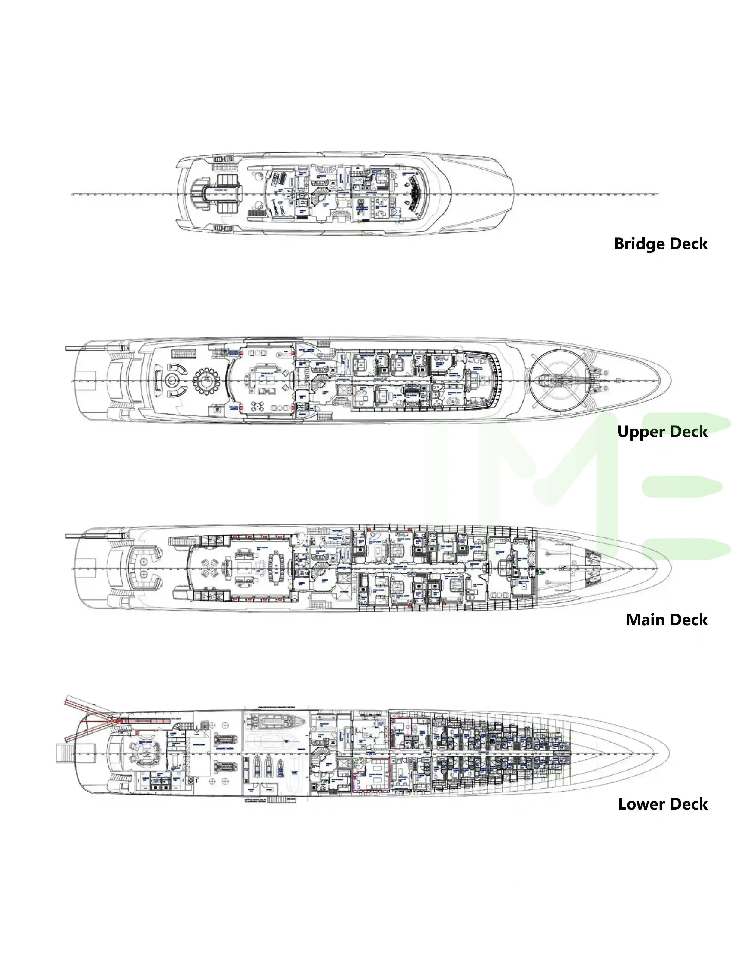 Request plans that include the layout of staterooms, guest areas, and outdoor spaces, as well as crew quarters and work areas.