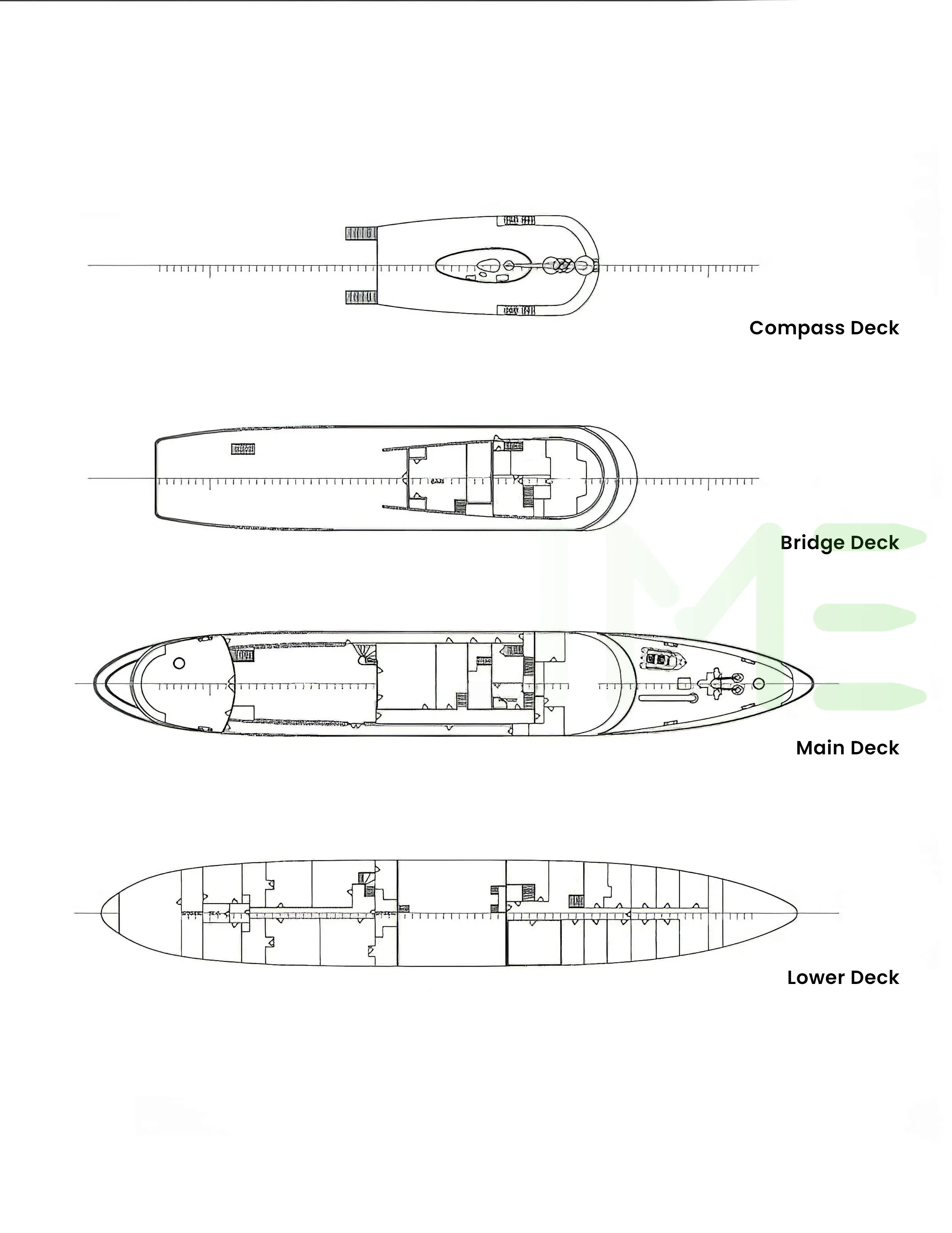 Request plans that include the layout of staterooms, guest areas, and outdoor spaces, as well as crew quarters and work areas.