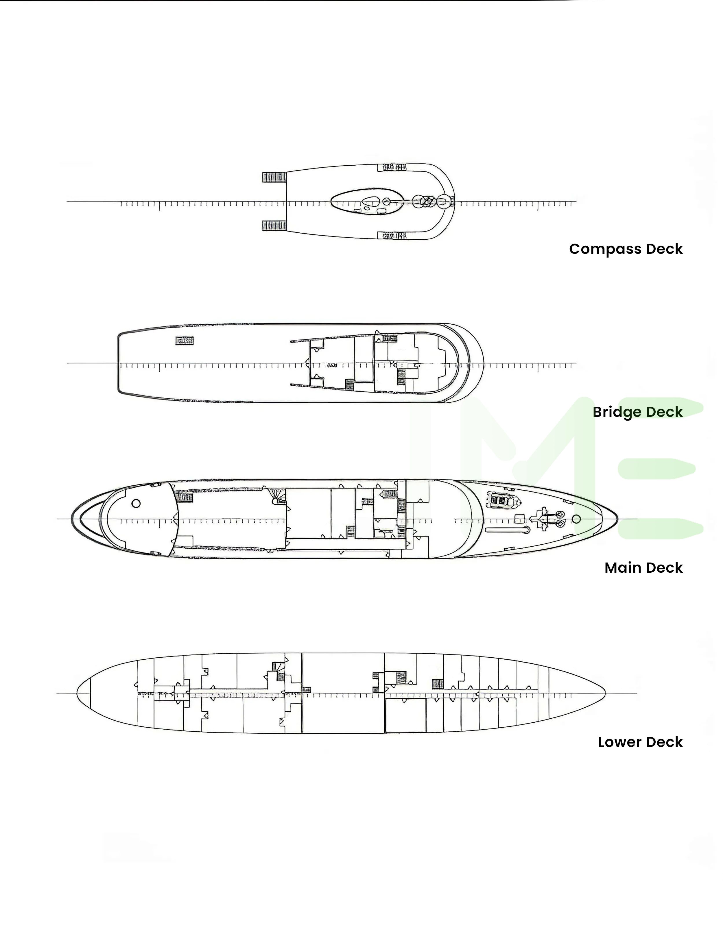 Request plans that include the layout of staterooms, guest areas, and outdoor spaces, as well as crew quarters and work areas.
