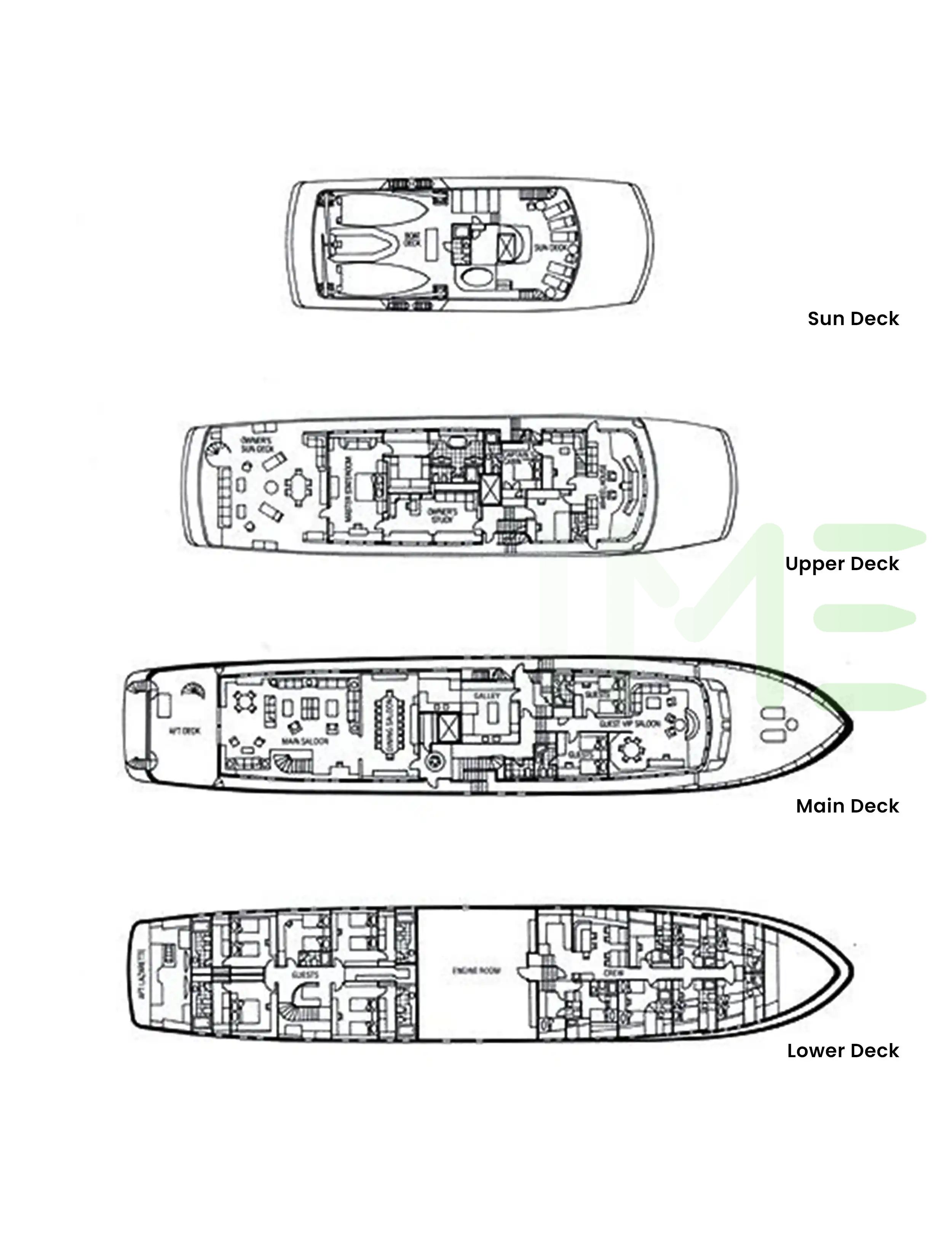 Request plans that include the layout of staterooms, guest areas, and outdoor spaces, as well as crew quarters and work areas.