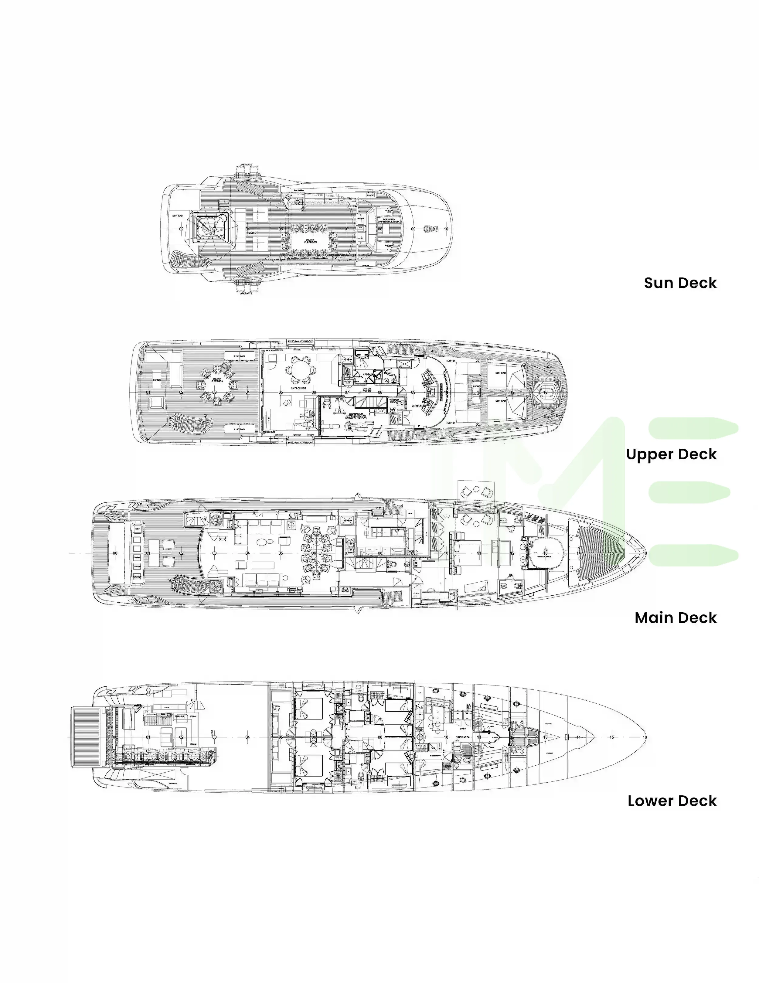 Request plans that include the layout of staterooms, guest areas, and outdoor spaces, as well as crew quarters and work areas.