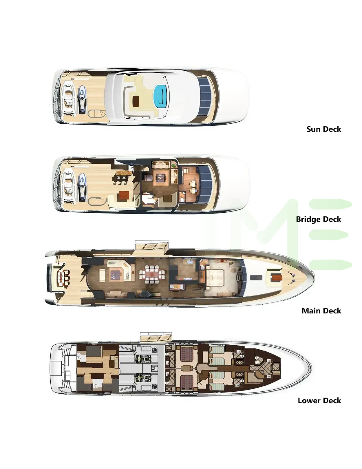 Request plans that include the layout of staterooms, guest areas, and outdoor spaces, as well as crew quarters and work areas.