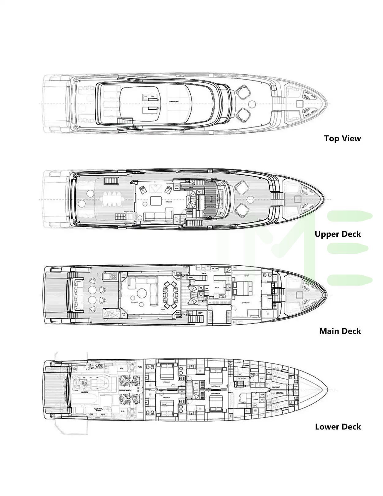Request plans that include the layout of staterooms, guest areas, and outdoor spaces, as well as crew quarters and work areas.
