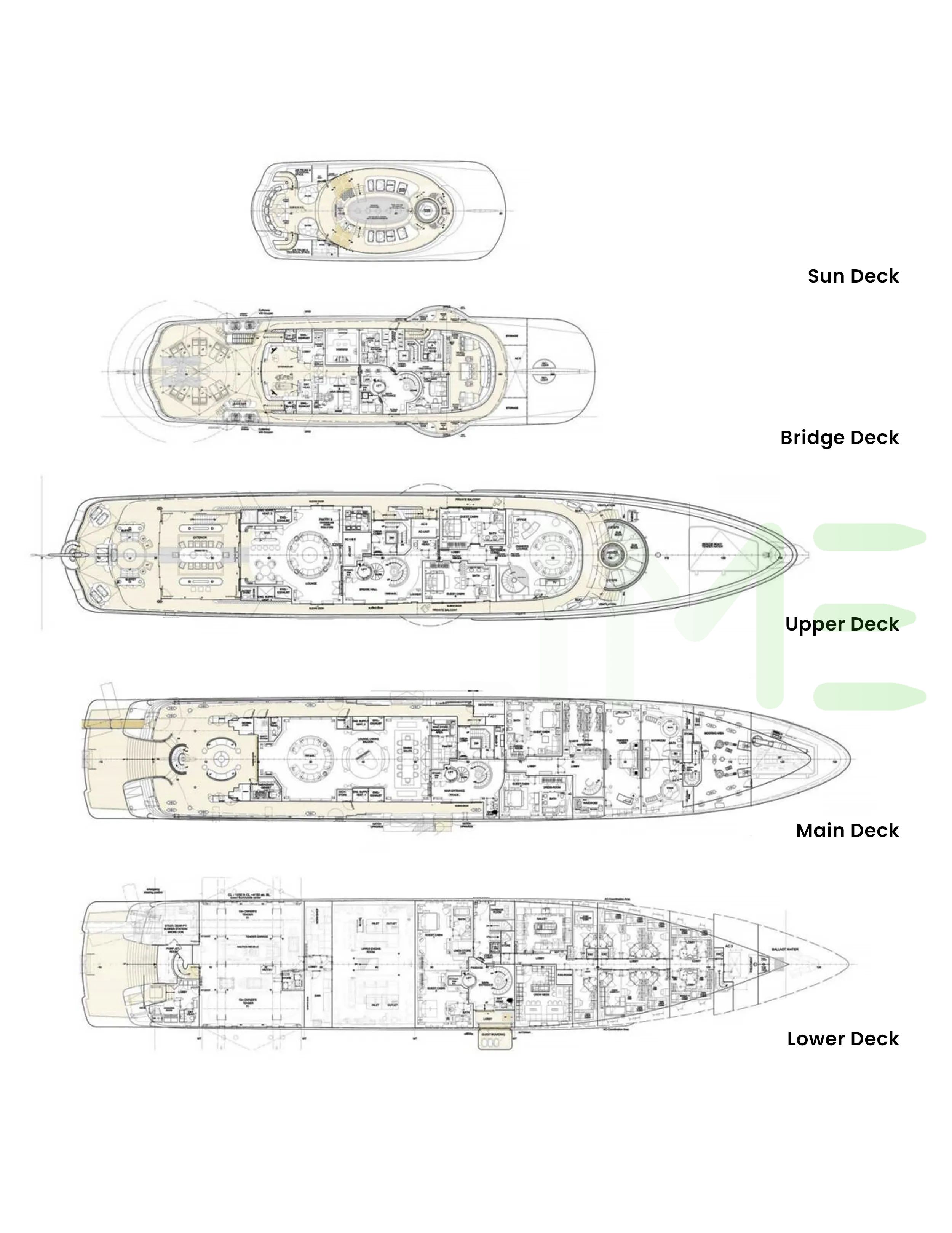 Request plans that include the layout of staterooms, guest areas, and outdoor spaces, as well as crew quarters and work areas.