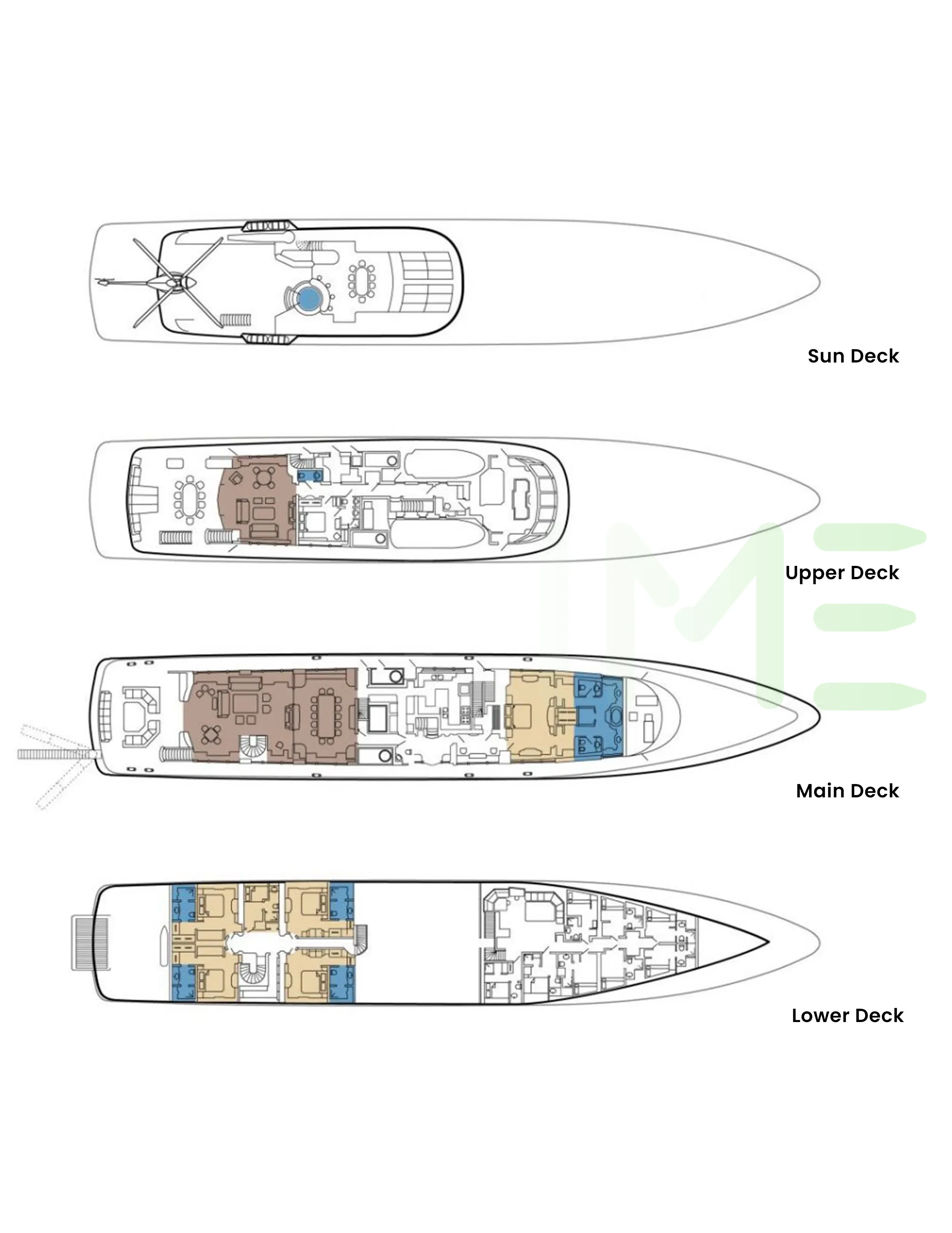 Request plans that include the layout of staterooms, guest areas, and outdoor spaces, as well as crew quarters and work areas.