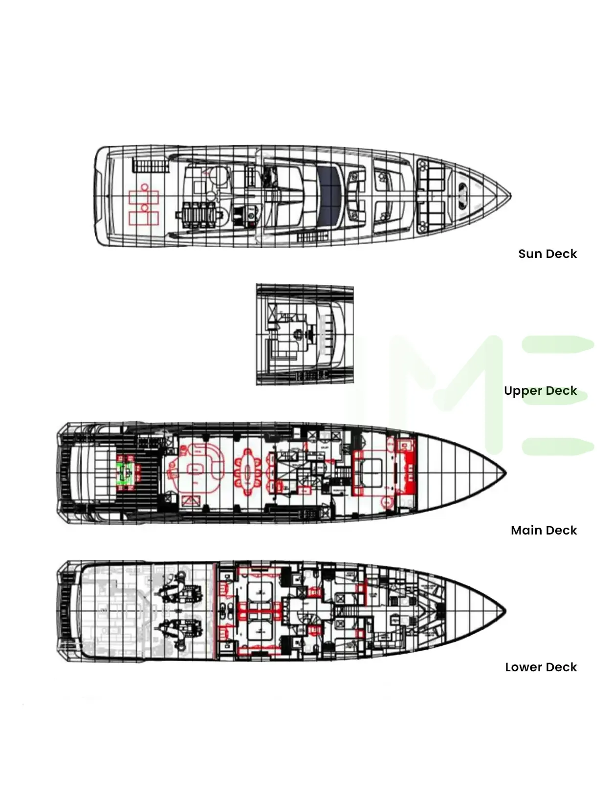 Request plans that include the layout of staterooms, guest areas, and outdoor spaces, as well as crew quarters and work areas.