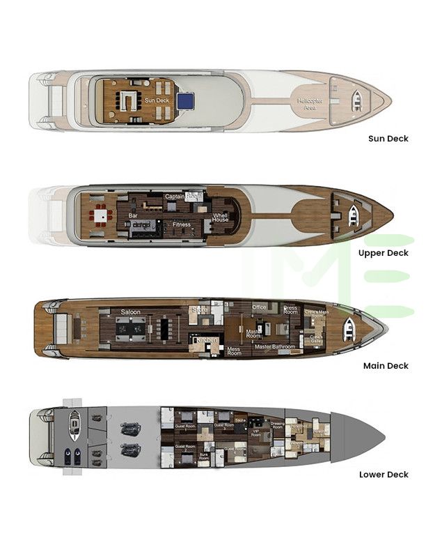 Request plans that include the layout of staterooms, guest areas, and outdoor spaces, as well as crew quarters and work areas.