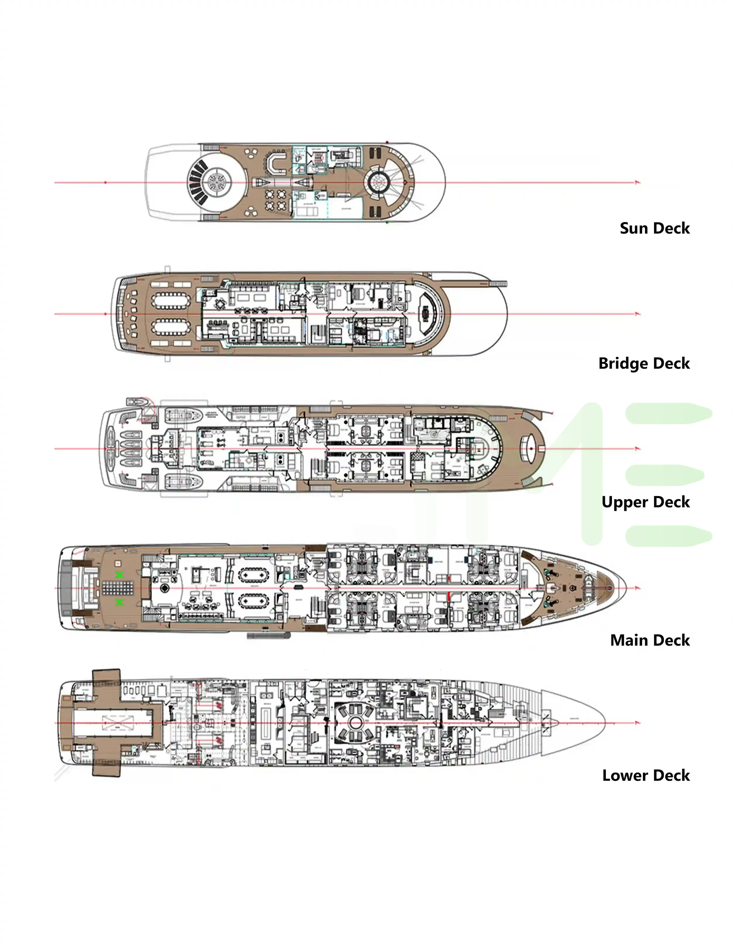 Request plans that include the layout of staterooms, guest areas, and outdoor spaces, as well as crew quarters and work areas.