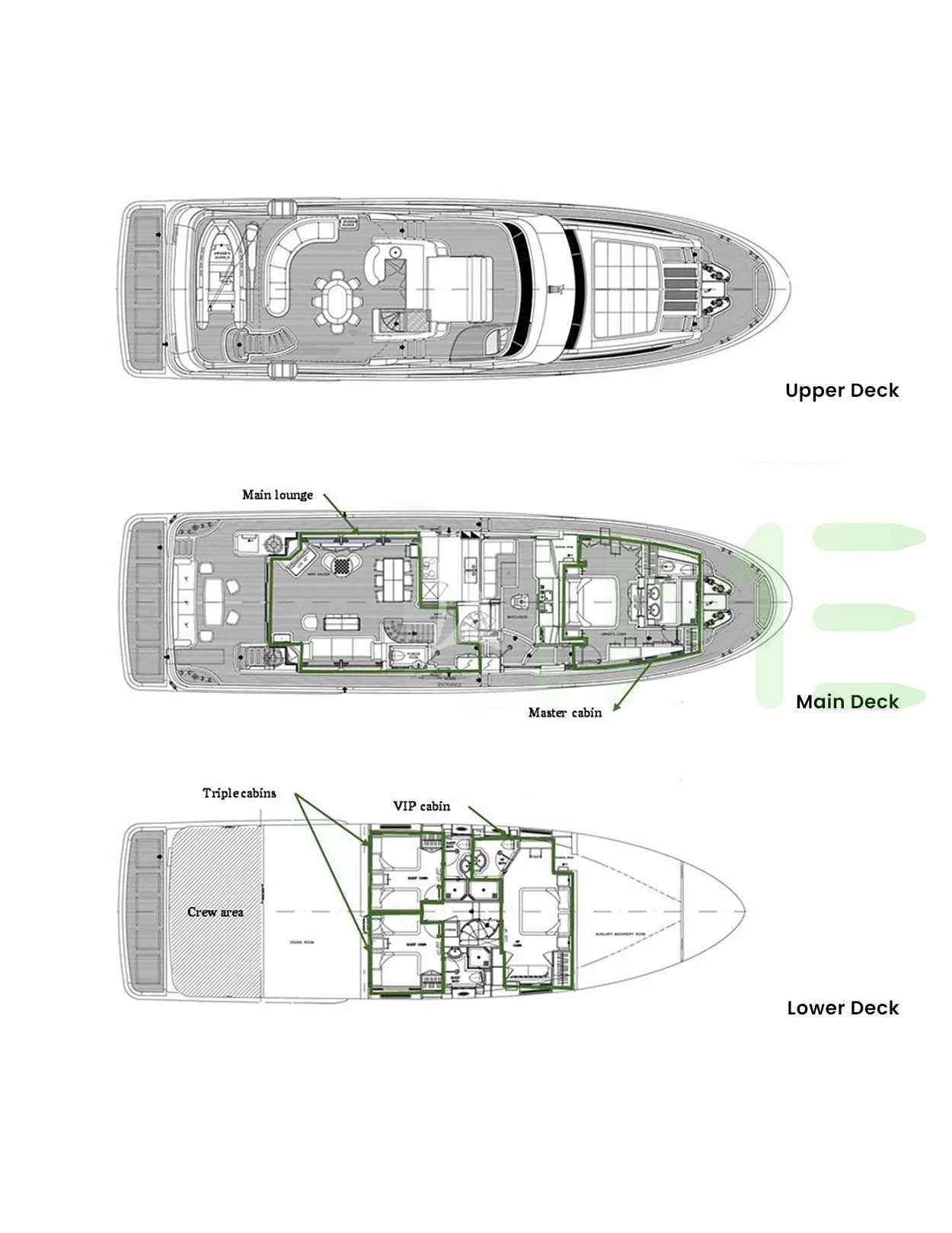 Request plans that include the layout of staterooms, guest areas, and outdoor spaces, as well as crew quarters and work areas.