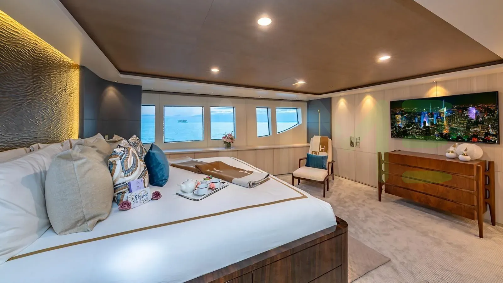 The styling of the REVERIE yacht features exterior design by Donald Starkey Designs and interior design by Donald Starkey Designs. Up to 12 guests can be accommodated on board the superyacht REVERIE in 6 staterooms. REVERIE also has accommodations for 13 crew members, including the yacht’s captain.