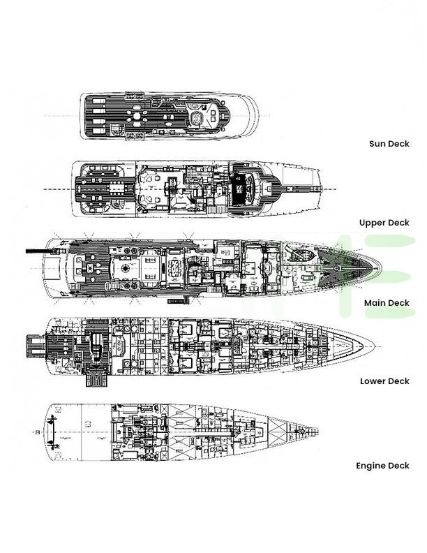 Request plans that include the layout of staterooms, guest areas, and outdoor spaces, as well as crew quarters and work areas.