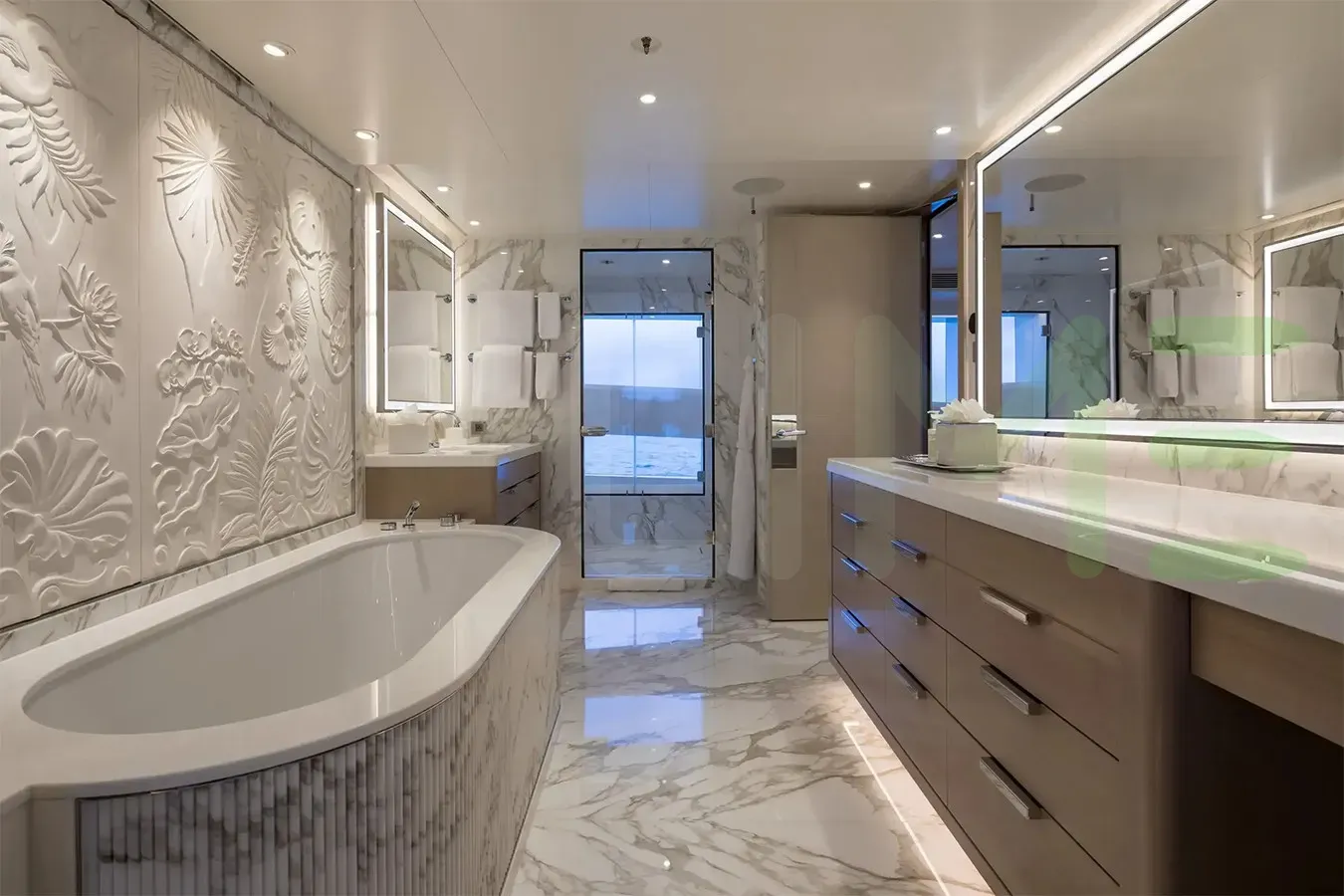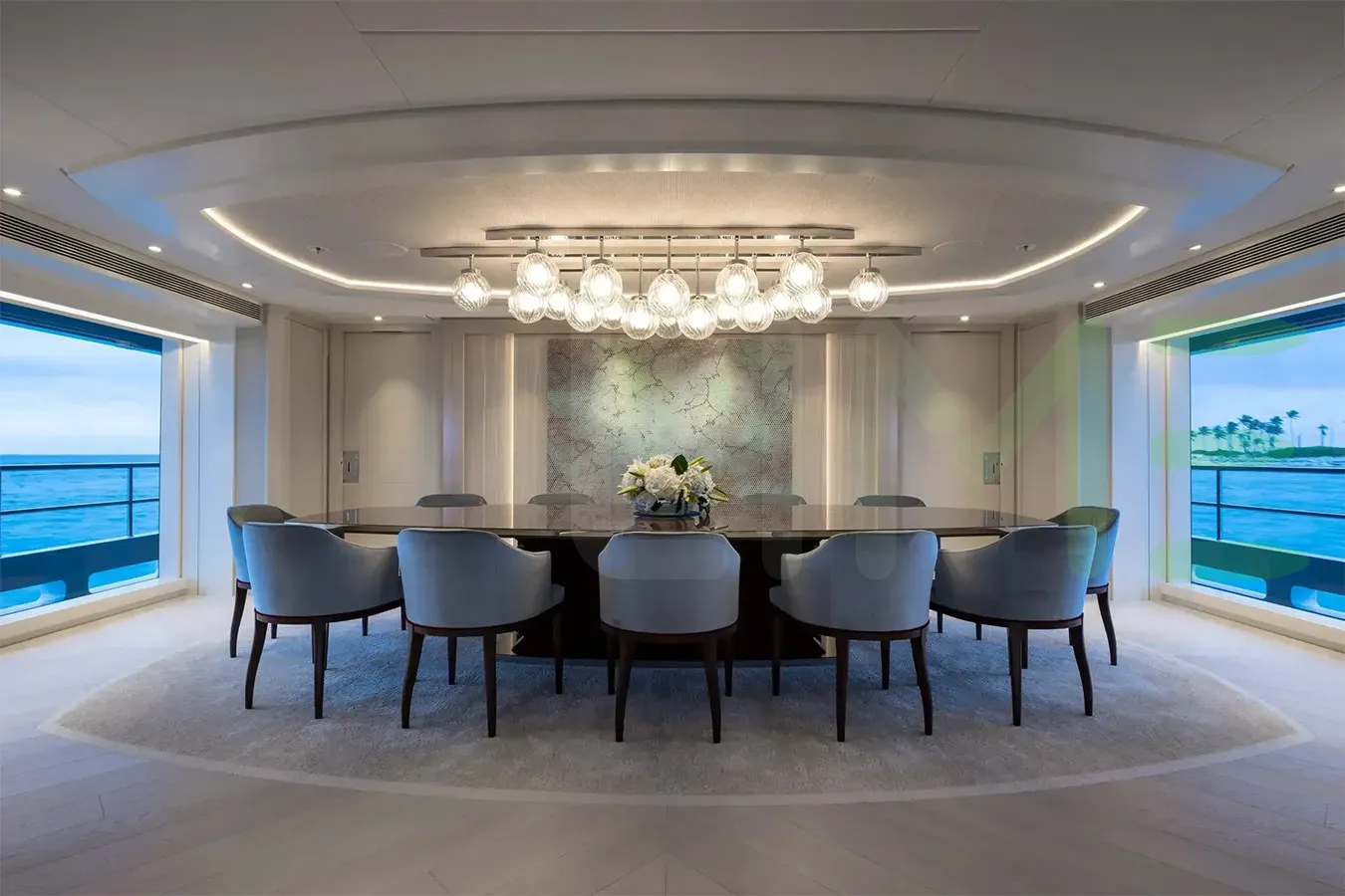 The styling of the SANTOSHA yacht features exterior design by Omega Architects and interior design by Harrison Eidsgaard. SANTOSHA also has accommodations for 13 crew members, including the yacht’s captain.