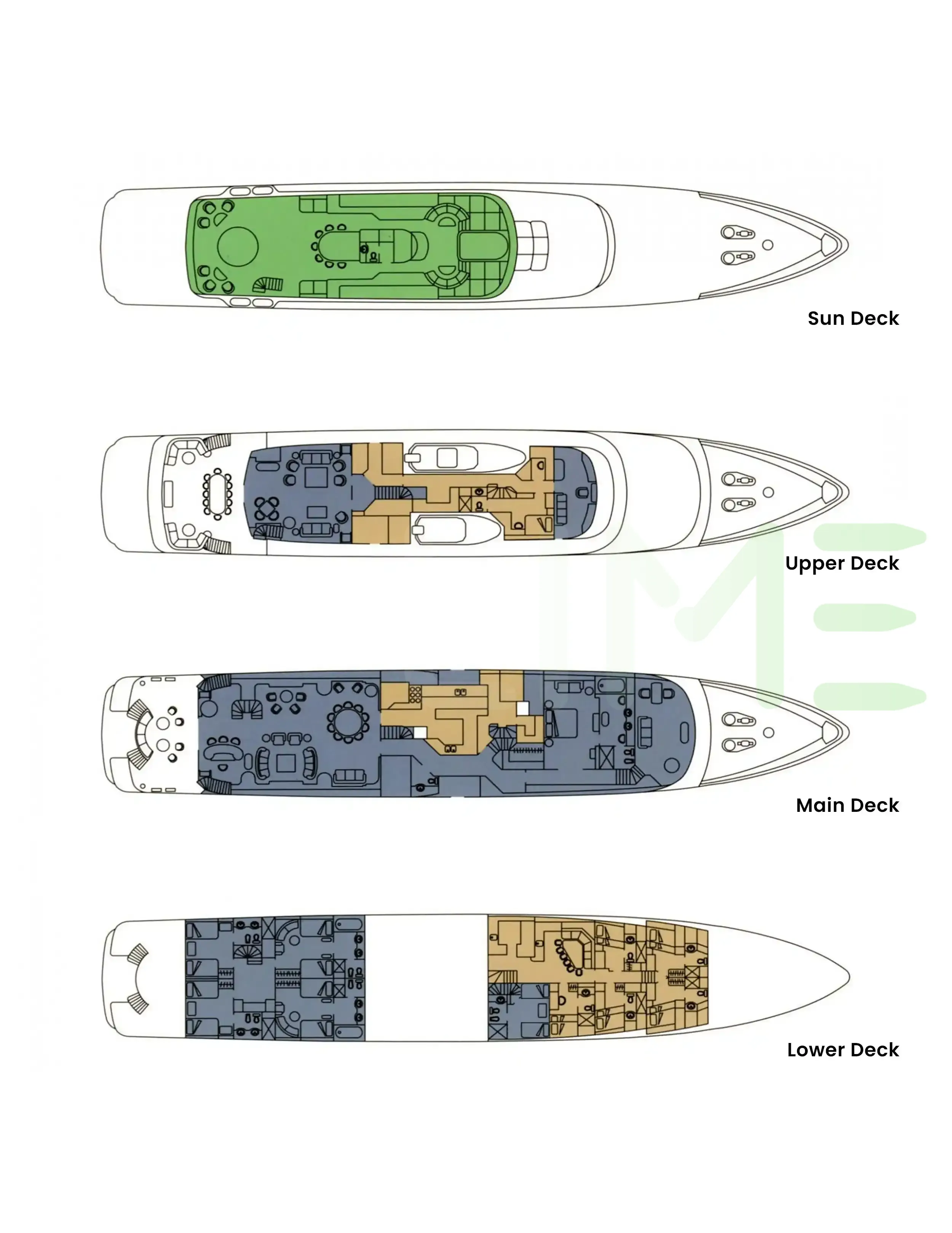 Request plans that include the layout of staterooms, guest areas, and outdoor spaces, as well as crew quarters and work areas.