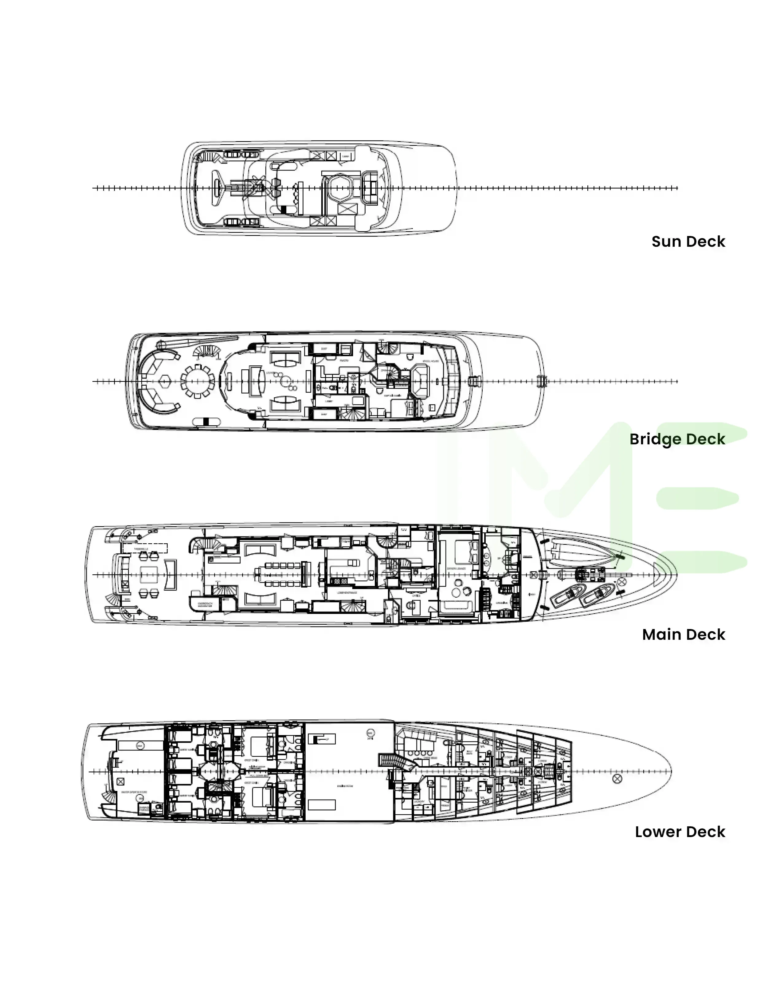 Request plans that include the layout of staterooms, guest areas, and outdoor spaces, as well as crew quarters and work areas.