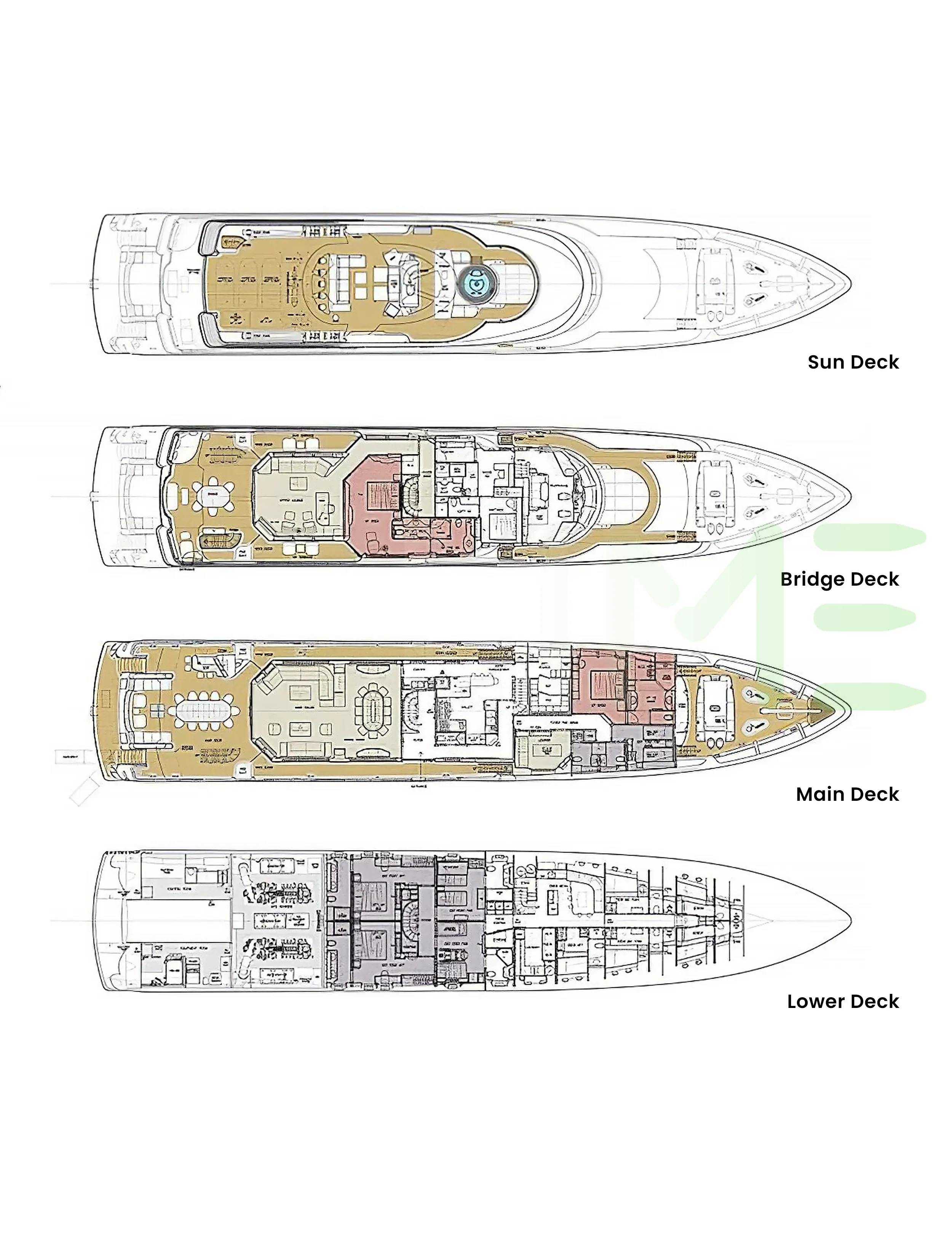 Request plans that include the layout of staterooms, guest areas, and outdoor spaces, as well as crew quarters and work areas.