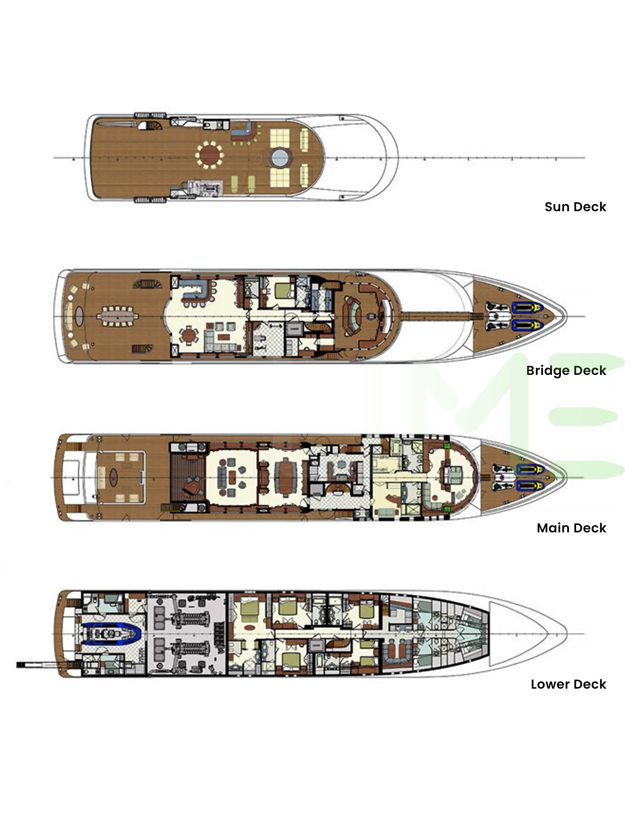 Request plans that include the layout of staterooms, guest areas, and outdoor spaces, as well as crew quarters and work areas.