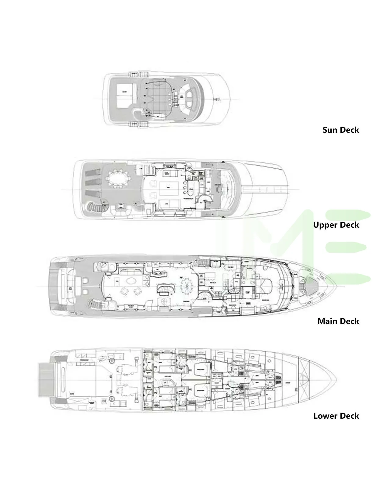 Request plans that include the layout of staterooms, guest areas, and outdoor spaces, as well as crew quarters and work areas.