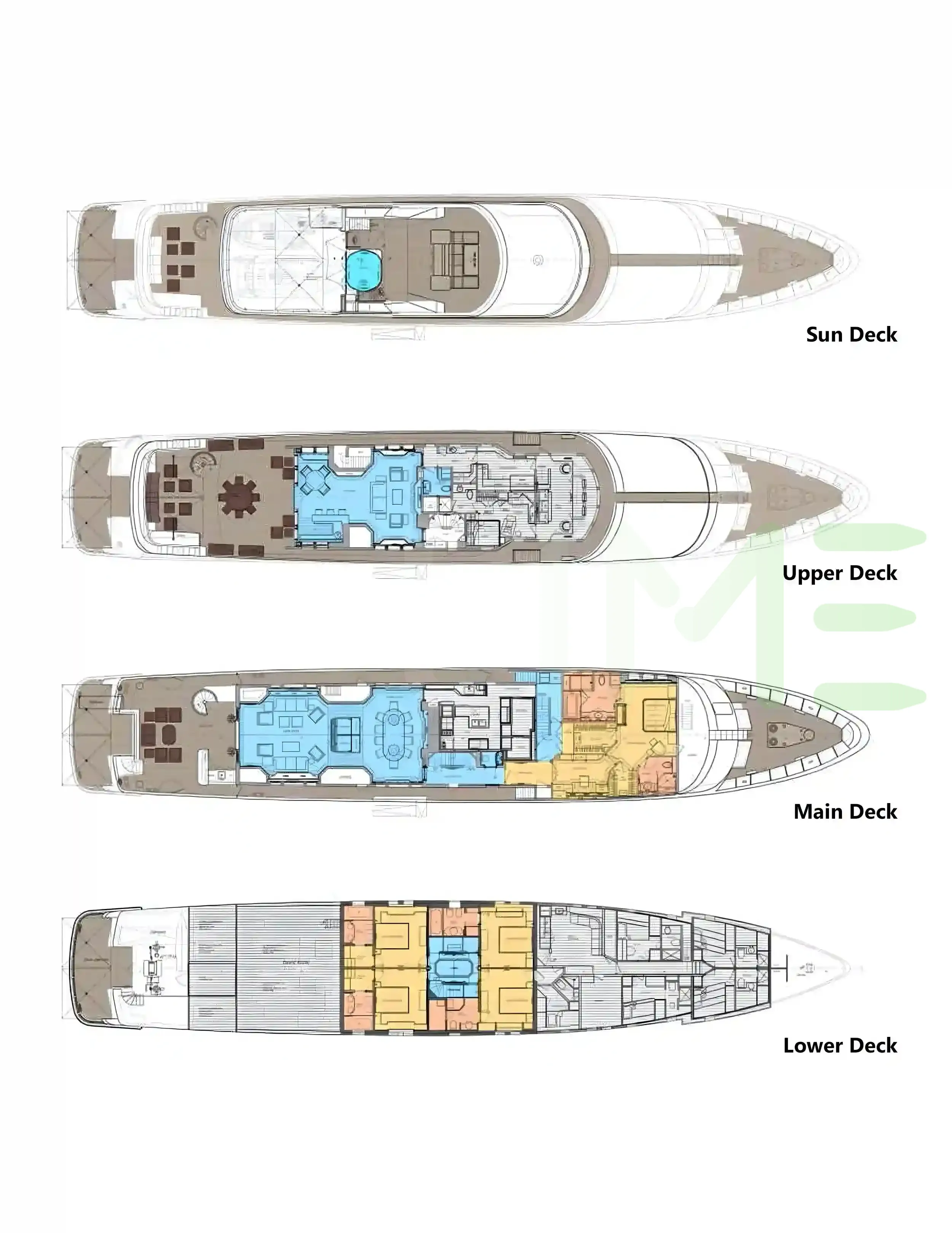 Request plans that include the layout of staterooms, guest areas, and outdoor spaces, as well as crew quarters and work areas.