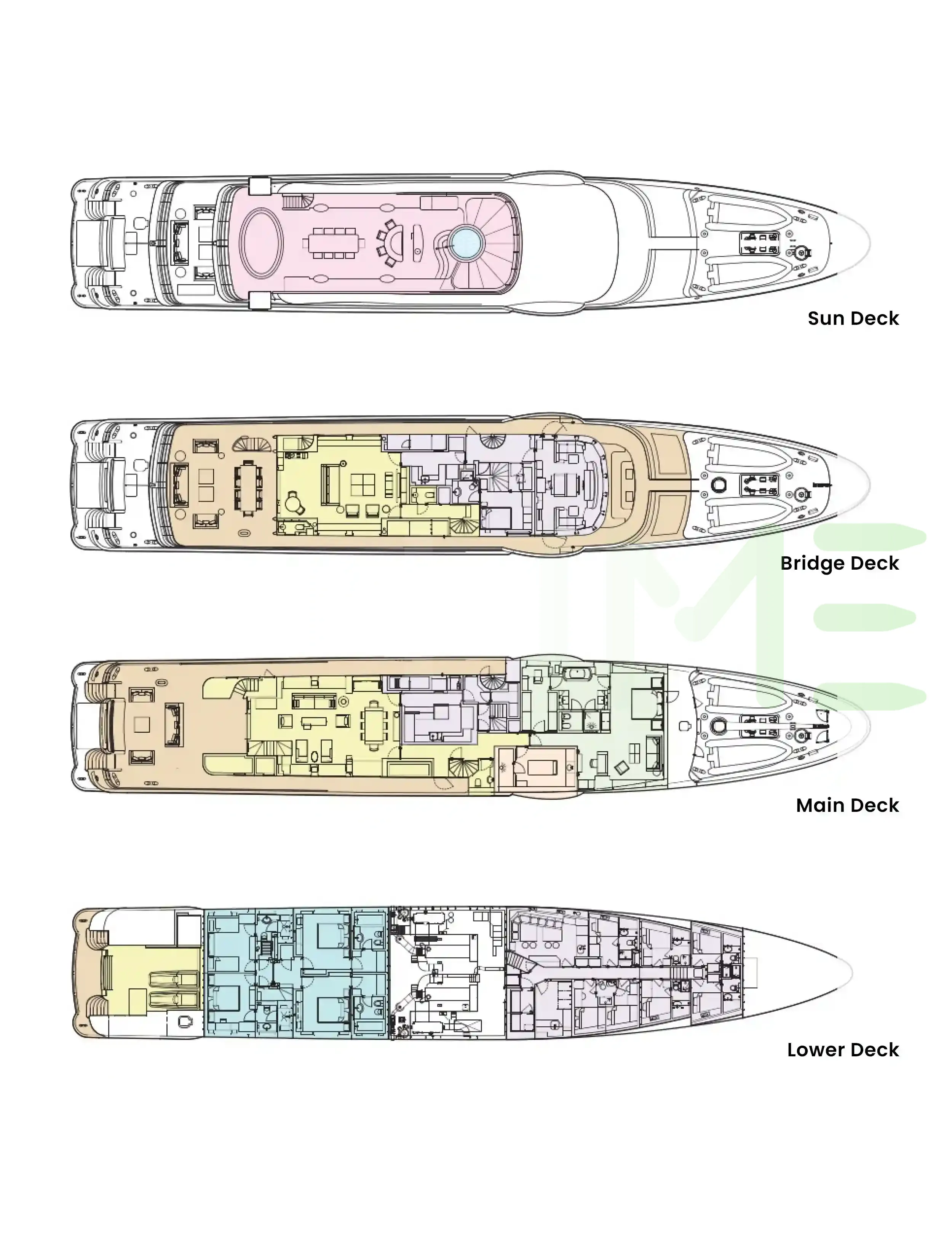 Request plans that include the layout of staterooms, guest areas, and outdoor spaces, as well as crew quarters and work areas.