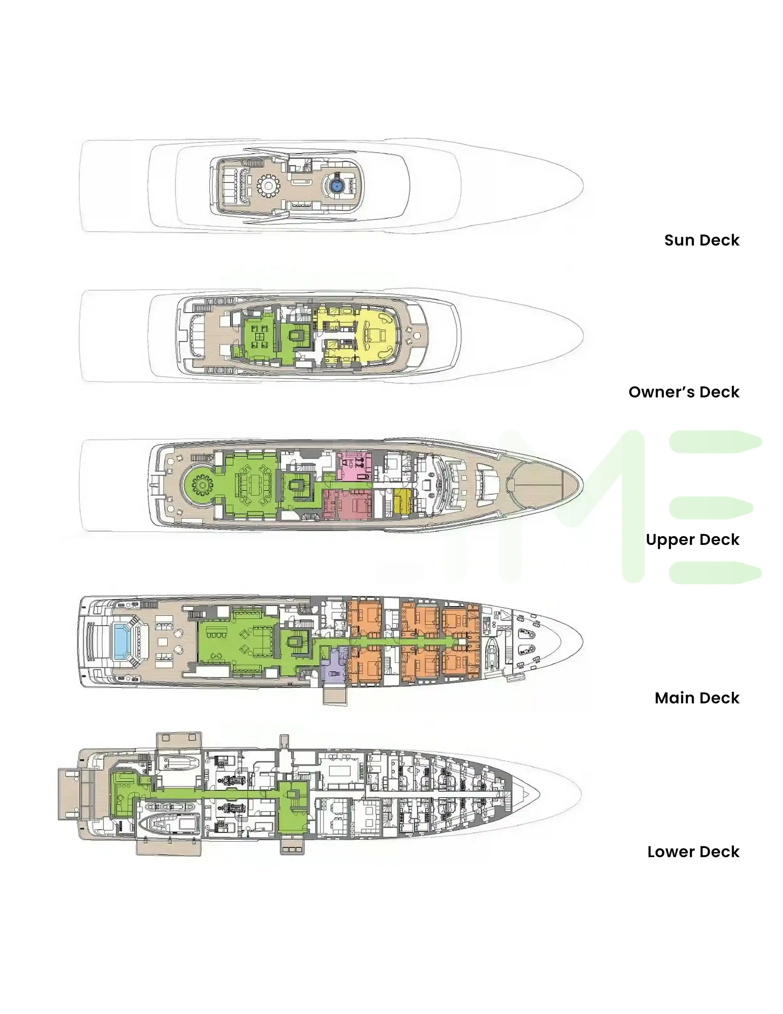Request plans that include the layout of staterooms, guest areas, and outdoor spaces, as well as crew quarters and work areas.