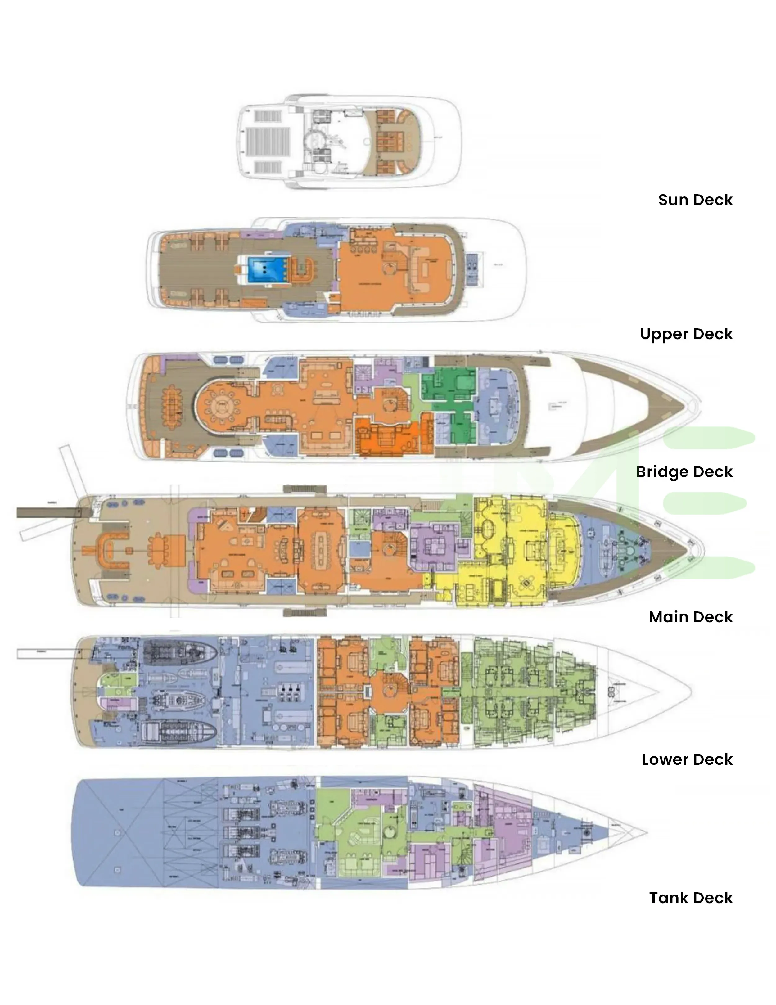 Request plans that include the layout of staterooms, guest areas, and outdoor spaces, as well as crew quarters and work areas.