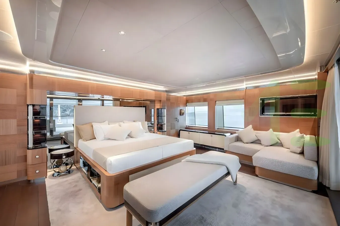 The styling of the SUNRISE yacht features exterior design by Ginton Naval Architects and interior design by Hot Lab. Up to 12 guests can be accommodated on board the superyacht SUNRISE in 5 staterooms. SUNRISE also has accommodations for 9 crew members, including the yacht’s captain.